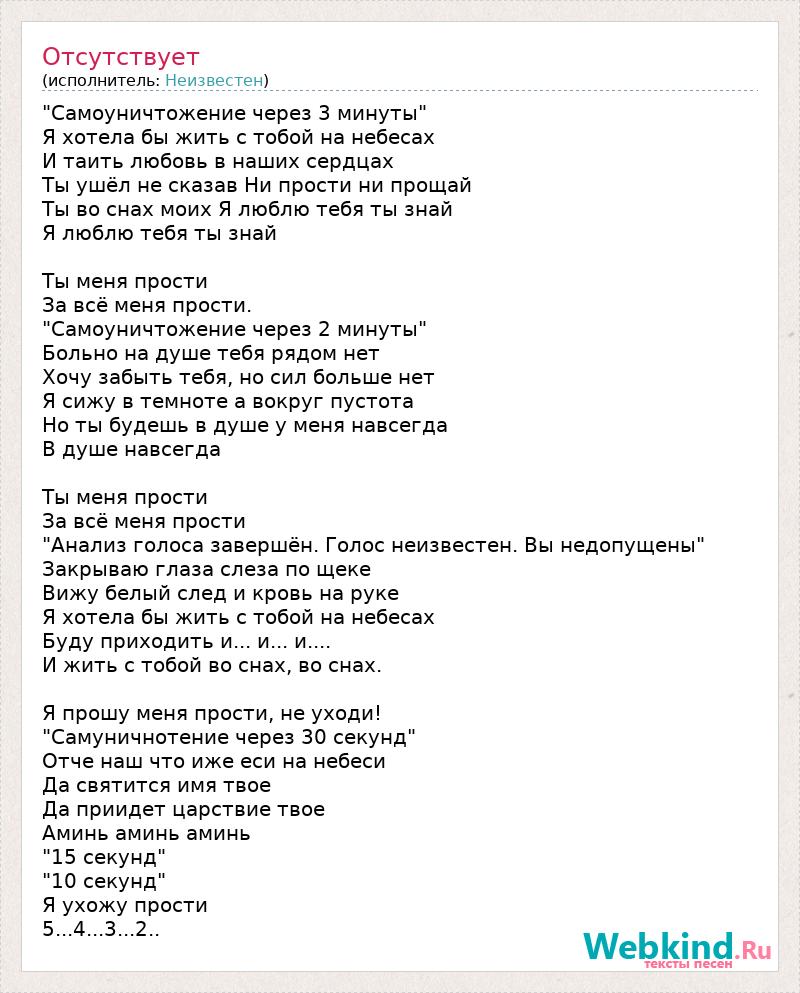 "Самоуничтожение через 3 минуты" Я хотела бы жить с тобой на небесах И таить любовь в наших сердцах Ты ушёл не сказав Ни прости ни прощай Ты во снах моих Я люблю тебя ты знай Я люблю тебя ты знай Ты меня прости За всё меня прости. "Самоуничтожение через 2 минуты" Больно на душе тебя рядом нет Хочу забыть тебя, но сил больше нет Я сижу в темноте а вокруг пустота Но ты будешь в душе у меня навсегда В душе навсегда Ты меня прости За всё меня прости "Анализ голоса завершён. Голос неизвестен. Вы недопущены" Закрываю глаза слеза по щеке Вижу белый след и кровь на руке Я хотела бы жить с тобой на небесах Буду приходить и... и... и.... И жить с тобой во снах, во снах. Я прошу меня прости, не уходи! "Самуничнотение через 30 секунд" Отче наш что иже еси на небеси Да святится имя твое Да приидет царствие твое Аминь аминь аминь "15 секунд" "10 секунд" Я ухожу прости 5...4...3...2..