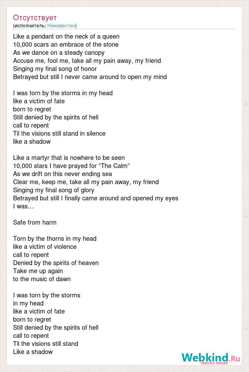Like a pendant on the neck of a queen 10,000 scars an embrace of the stone As we dance on a steady canopy Accuse me, fool me, take all my pain away, my friend Singing my final song of honor Betrayed but still I never came around to open my mind I was torn by the storms in my head like a victim of fate born to regret Still denied by the spirits of [bad word] call to repent Til the visions still stand in silence like a shadow Like a martyr that is nowhere to be seen 10,000 stars I have prayed for “The Calm” As we drift on this never ending sea Clear me, keep me, take all my pain away, my friend Singing my final song of glory Betrayed but still I finally came around and opened my eyes I was… Safe from harm Torn by the thorns in my head like a victim of violence call to repent Denied by the spirits of heaven Take me up again to the music of dawn I was torn by the storms in my head like a victim of fate born to regret Still denied by the spirits of [bad word] call to repent Til the visions still stand Like a shadow