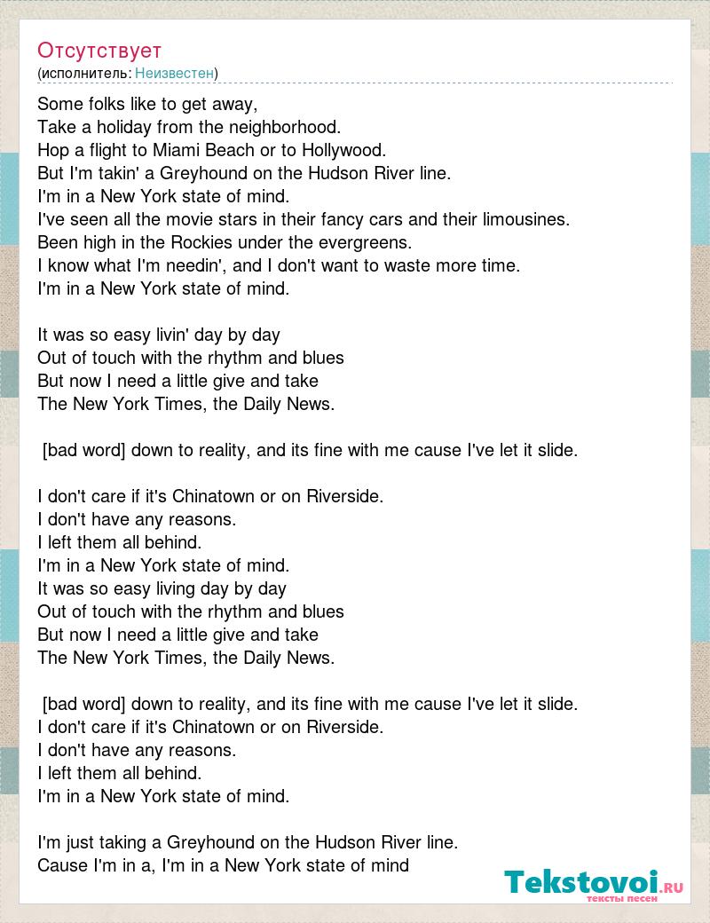 Some folks like to get away, Take a holiday from the neighborhood. Hop a flight to Miami Beach or to Hollywood. But I'm takin' a Greyhound on the Hudson River line. I'm in a New York state of mind. I've seen all the movie stars in their fancy cars and their limousines. Been high in the Rockies under the evergreens. I know what I'm needin', and I don't want to waste more time. I'm in a New York state of mind. It was so easy livin' day by day Out of touch with the rhythm and blues But now I need a little give and take The New York Times, the Daily News. [bad word] down to reality, and its fine with me cause I've let it slide. I don't care if it's Chinatown or on Riverside. I don't have any reasons. I left them all behind. I'm in a New York state of mind. It was so easy living day by day Out of touch with the rhythm and blues But now I need a little give and take The New York Times, the Daily News. [bad word] down to reality, and its fine with me cause I've let it slide. I don't care if it's Chinatown or on Riverside. I don't have any reasons. I left them all behind. I'm in a New York state of mind. I'm just taking a Greyhound on the Hudson River line. Cause I'm in a, I'm in a New York state of mind