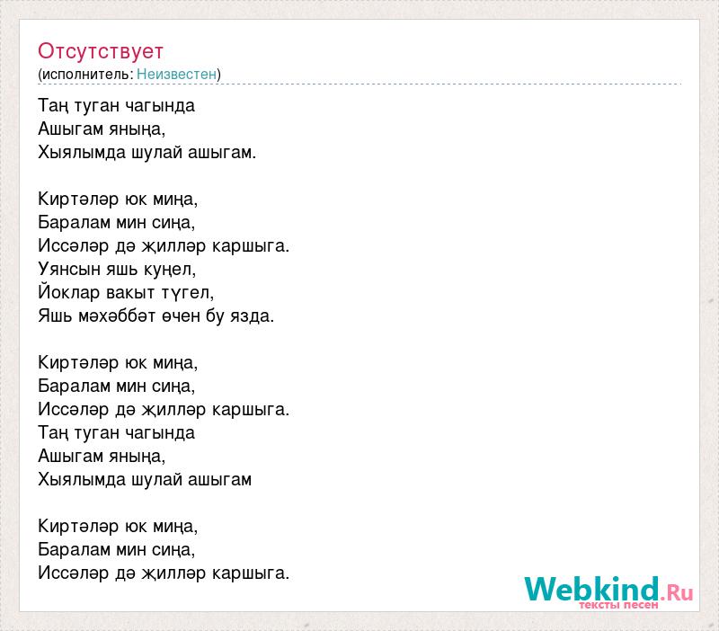 Таң туган чагында Ашыгам яныңа, Хыялымда шулай ашыгам. Киртәләр юк миңа, Баралам мин сиңа, Иссәләр дә җилләр каршыга. Уянсын яшь куңел, Йоклар вакыт түгел, Яшь мәхәббәт өчен бу язда. Киртәләр юк миңа, Баралам мин сиңа, Иссәләр дә җилләр каршыга. Таң туган чагында Ашыгам яныңа, Хыялымда шулай ашыгам Киртәләр юк миңа, Баралам мин сиңа, Иссәләр дә җилләр каршыга.