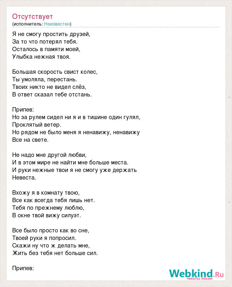 Я не смогу простить друзей, За то что потерял тебя. Осталось в памяти моей, Улыбка нежная твоя. Большая скорость свист колес, Ты умоляла, перестань. Твоих никто не видел слёз, В ответ сказал тебе отстань. Припев: Но за рулем сидел ни я и в тишине один гулял, Проклятый ветер. Но рядом не было меня я ненавижу, ненавижу Все на свете. Не надо мне другой любви, И в этом мире не найти мне больше места. И руки нежные твои я не смогу уже держать Невеста. Вхожу я в комнату твою, Все как всегда тебя лишь нет. Тебя по прежнему люблю, В окне твой вижу силуэт. Все было просто как во сне, Твоей руки я попросил. Скажи ну что ж делать мне, Жить без тебя нет больше сил. Припев: