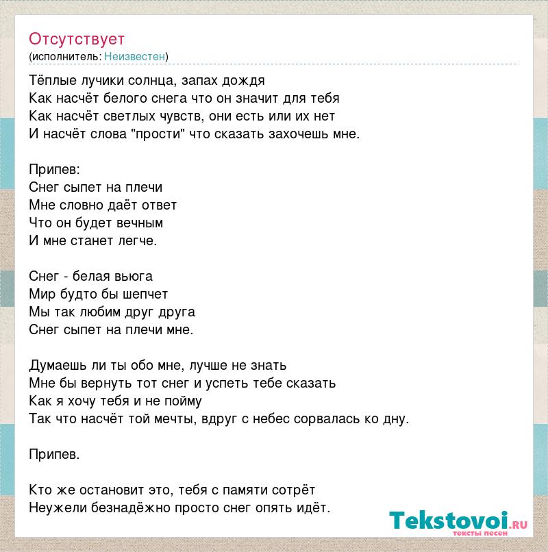 Тёплые лучики солнца, запах дождя Как насчёт белого снега что он значит для тебя Как насчёт светлых чувств, они есть или их нет И насчёт слова "прости" что сказать захочешь мне. Припев: Снег сыпет на плечи Мне словно даёт ответ Что он будет вечным И мне станет легче. Снег - белая вьюга Мир будто бы шепчет Мы так любим друг друга Снег сыпет на плечи мне. Думаешь ли ты обо мне, лучше не знать Мне бы вернуть тот снег и успеть тебе сказать Как я хочу тебя и не пойму Так что насчёт той мечты, вдруг с небес сорвалась ко дну. Припев. Кто же остановит это, тебя с памяти сотрёт Неужели безнадёжно просто снег опять идёт.