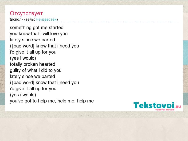 something got me started you know that i will love you lately since we parted i [bad word] know that i need you i'd give it all up for you (yes i would) totally broken hearted guilty of what i did to you lately since we parted i [bad word] know that i need you i'd give it all up for you (yes i would) you've got to help me, help me, help me