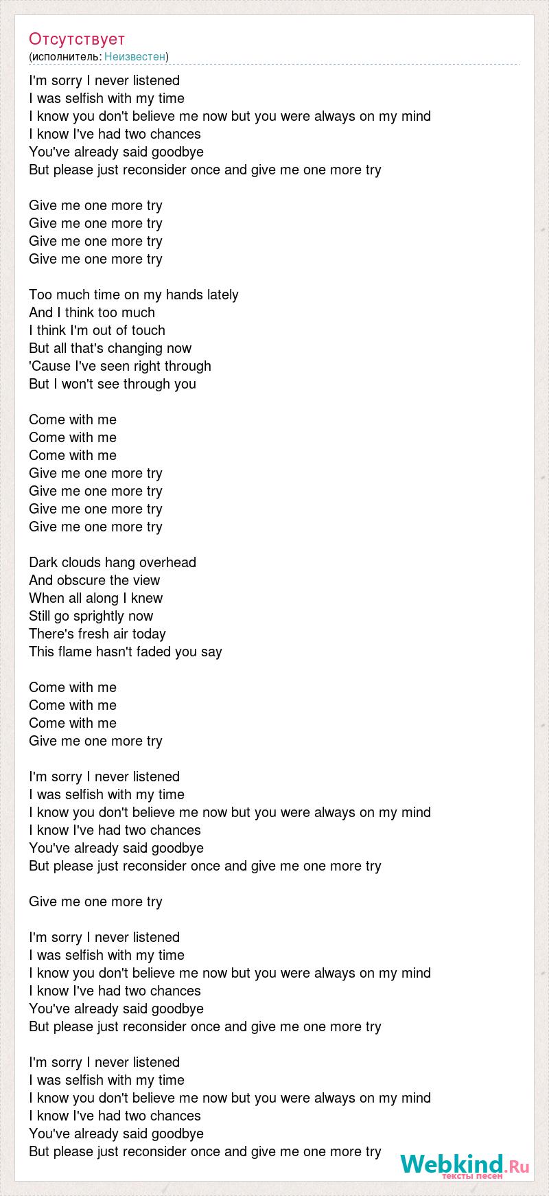 I'm sorry I never listened I was selfish with my time I know you don't believe me now but you were always on my mind I know I've had two chances You've already said goodbye But please just reconsider once and give me one more try Give me one more try Give me one more try Give me one more try Give me one more try Too much time on my hands lately And I think too much I think I'm out of touch But all that's changing now 'Cause I've seen right through But I won't see through you [bad word] with [bad word] with [bad word] with me Give me one more try Give me one more try Give me one more try Give me one more try Dark clouds hang overhead And obscure the view When all along I knew Still go sprightly now There's fresh air today This flame hasn't faded you say [bad word] with [bad word] with [bad word] with me Give me one more try I'm sorry I never listened I was selfish with my time I know you don't believe me now but you were always on my mind I know I've had two chances You've already said goodbye But please just reconsider once and give me one more try Give me one more try I'm sorry I never listened I was selfish with my time I know you don't believe me now but you were always on my mind I know I've had two chances You've already said goodbye But please just reconsider once and give me one more try I'm sorry I never listened I was selfish with my time I know you don't believe me now but you were always on my mind I know I've had two chances You've already said goodbye But please just reconsider once and give me one more try