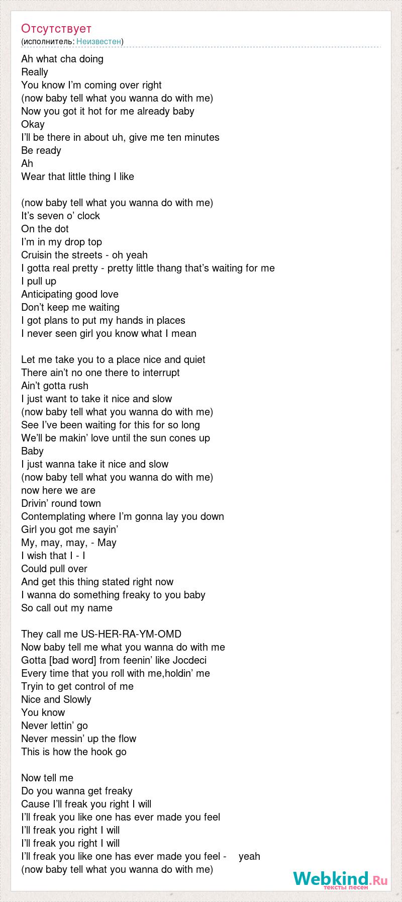 Ah what cha doing Really You know [bad word] over right (now baby tell what you wanna do with me) Now you got it hot for me already baby Okay I’ll be there in about uh, give me ten minutes Be ready Ah Wear that little thing I like (now baby tell what you wanna do with me) It’s seven o’ clock On the dot I’m in my drop top [bad word] the streets - oh yeah I gotta real pretty - pretty little thang that’s waiting for me I pull up Anticipating good love Don’t keep me waiting I got plans to put my hands in places I never seen girl you know what I mean Let me take you to a place nice and quiet There ain’t no one there to [bad word] Ain’t [bad word] I just want to take it nice and slow (now baby tell what you wanna do with me) See I’ve been waiting for this for so long We’ll be makin’ love until the sun cones up Baby I just wanna take it nice and slow (now baby tell what you wanna do with me) now here we are Drivin’ round town Contemplating where I’m gonna lay you down Girl you got me sayin’ My, may, may, - May I wish that I - I Could pull over And get this thing stated right now I wanna do something freaky to you baby So call out my name They call me US-HER-RA-YM-OMD Now baby tell me what you wanna do with me Gotta [bad word] from feenin’ like Jocdeci Every time that you roll with me,holdin’ me Tryin to get control of me Nice and Slowly You know Never lettin’ go Never messin’ up the flow This is how the hook go Now tell me Do you wanna get freaky Cause I’ll freak you right I will I’ll freak you like one has ever made you feel I’ll freak you right I will I’ll freak you right I will I’ll freak you like one has ever made you feel - yeah (now baby tell what you wanna do with me)