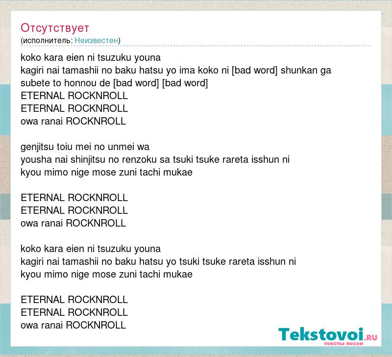 koko kara eien ni tsuzuku youna kagiri nai tamashii no baku hatsu yo ima koko ni [bad word] shunkan ga subete to honnou de [bad word] [bad word] ETERNAL ROCKNROLL ETERNAL ROCKNROLL owa ranai ROCKNROLL genjitsu toiu mei no unmei wa yousha nai shinjitsu no renzoku sa tsuki tsuke rareta isshun ni kyou mimo nige mose zuni tachi mukae ETERNAL ROCKNROLL ETERNAL ROCKNROLL owa ranai ROCKNROLL koko kara eien ni tsuzuku youna kagiri nai tamashii no baku hatsu yo tsuki tsuke rareta isshun ni kyou mimo nige mose zuni tachi mukae ETERNAL ROCKNROLL ETERNAL ROCKNROLL owa ranai ROCKNROLL