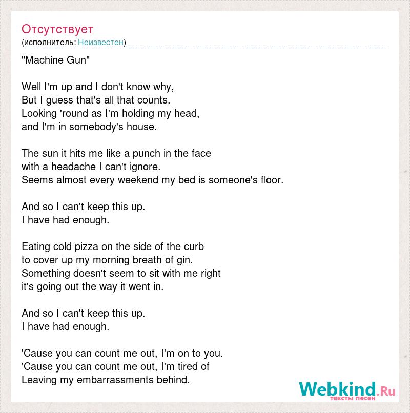 "Machine Gun" Well I'm up and I don't know why, But I guess that's all that counts. Looking 'round as I'm holding my head, and I'm in somebody's house. The sun it hits me like a punch in the face with a headache I can't ignore. Seems almost every weekend my bed is someone's floor. And so I can't keep this up. I have had enough. Eating cold pizza on the side of the curb to cover up my morning breath of gin. Something doesn't seem to sit with me right it's going out the way it went in. And so I can't keep this up. I have had enough. 'Cause you can count me out, I'm on to you. 'Cause you can count me out, I'm tired of Leaving my embarrassments behind.