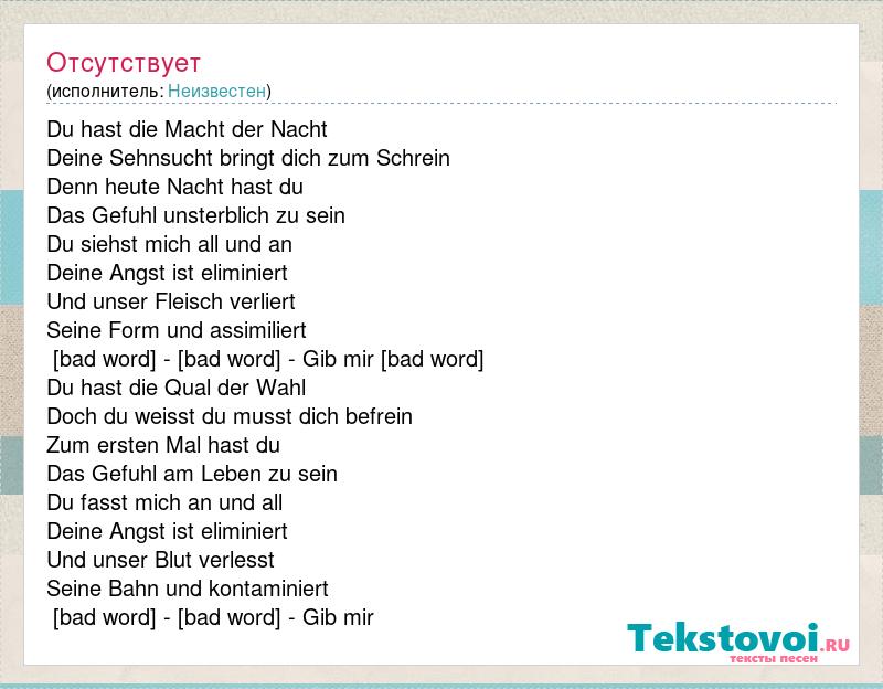 Du hast die Macht der Nacht Deine Sehnsucht bringt dich zum Schrein Denn heute Nacht hast du Das Gefuhl unsterblich zu sein Du siehst mich all und an Deine Angst ist eliminiert Und unser Fleisch verliert Seine Form und assimiliert [bad word] - [bad word] - Gib mir [bad word] Du hast die Qual der Wahl Doch du weisst du musst dich befrein Zum ersten Mal hast du Das Gefuhl am Leben zu sein Du fasst mich an und all Deine Angst ist eliminiert Und unser Blut verlesst Seine Bahn und kontaminiert [bad word] - [bad word] - Gib mir