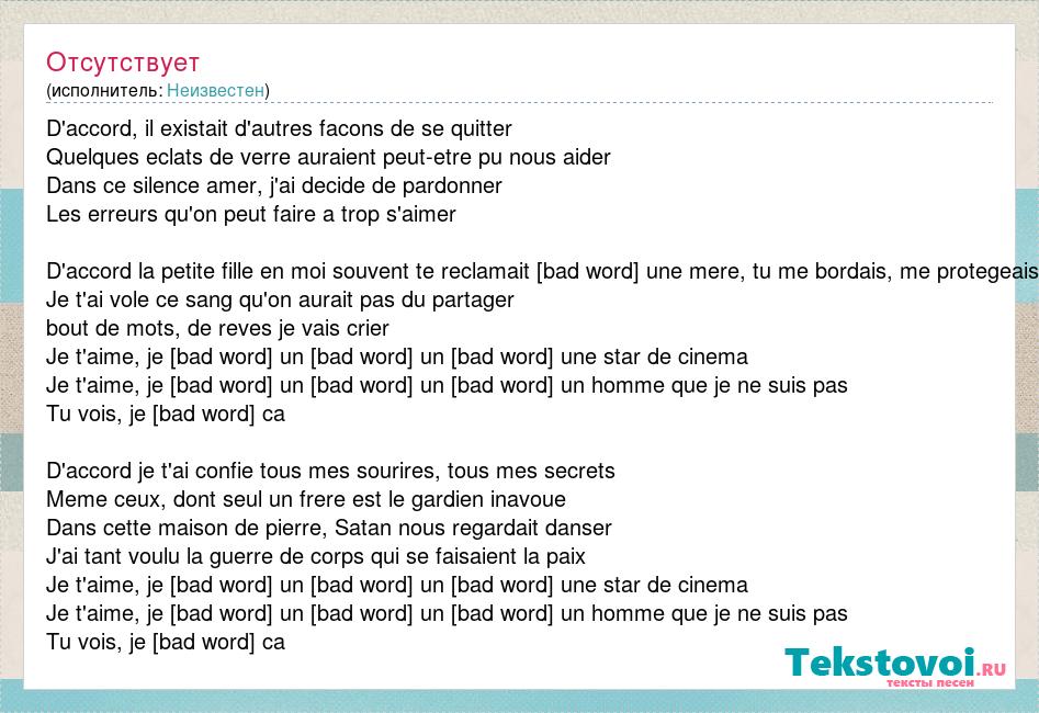 D'accord, il existait d'autres facons de se quitter Quelques eclats de verre auraient peut-etre pu nous aider Dans ce silence amer, j'ai decide de pardonner Les erreurs qu'on peut faire a trop s'aimer D'accord la petite fille en moi souvent te reclamait [bad word] une mere, tu me bordais, me protegeais Je t'ai vole ce sang qu'on aurait pas du partager bout de mots, de reves je vais crier Je t'aime, je [bad word] un [bad word] un [bad word] une star de cinema Je t'aime, je [bad word] un [bad word] un [bad word] un homme que je ne suis pas Tu vois, je [bad word] ca D'accord je t'ai confie tous mes sourires, tous mes secrets Meme ceux, dont seul un frere est le gardien inavoue Dans cette maison de pierre, Satan nous regardait danser J'ai tant voulu la guerre de corps qui se faisaient la paix Je t'aime, je [bad word] un [bad word] un [bad word] une star de cinema Je t'aime, je [bad word] un [bad word] un [bad word] un homme que je ne suis pas Tu vois, je [bad word] ca