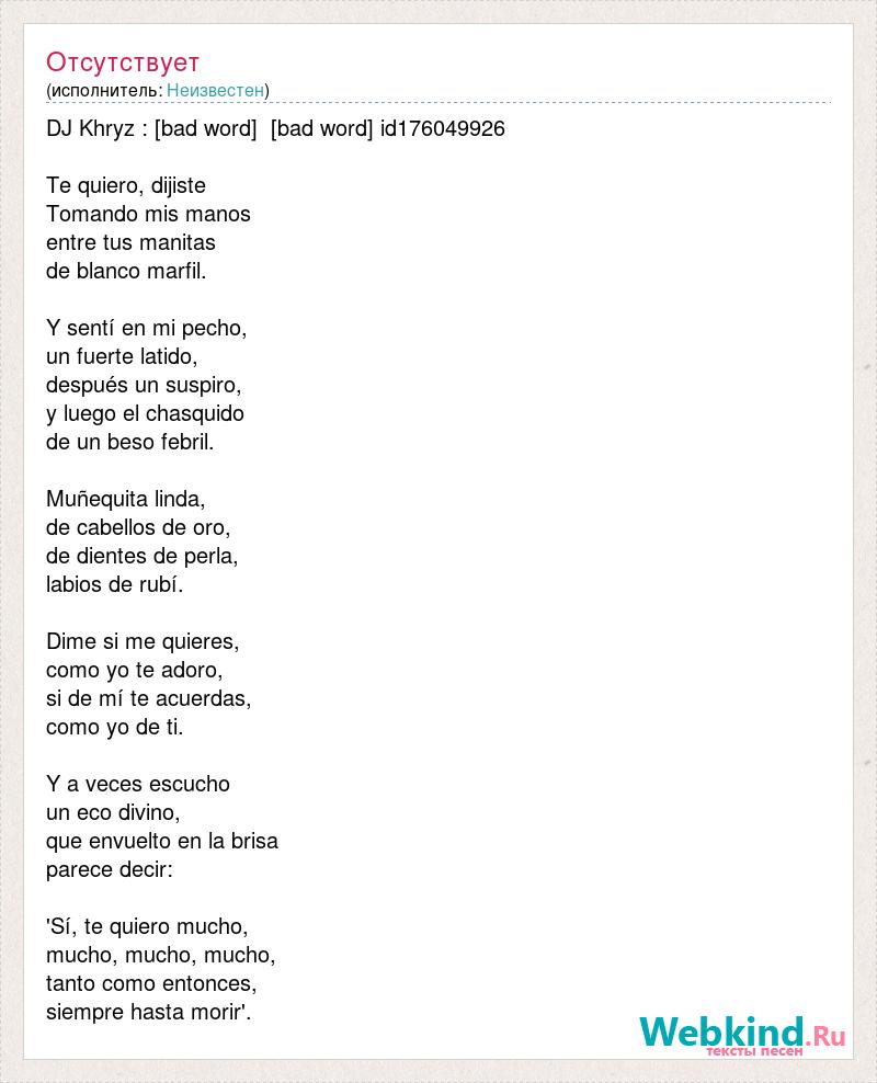 DJ Khryz : [bad word] [bad word] id176049926 Te quiero, dijiste Tomando mis manos entre tus manitas de blanco marfil. Y sentí en mi pecho, un fuerte latido, después un suspiro, y luego el chasquido de un beso febril. Muñequita linda, de cabellos de oro, de dientes de perla, labios [bad word] #237;. Dime si me quieres, [bad word] yo te adoro, si de mí te acuerdas, [bad word] yo de ti. Y a veces escucho un eco divino, que envuelto en la brisa parece decir: 'Sí, te quiero mucho, mucho, mucho, mucho, [bad word] entonces, siempre hasta morir'.
