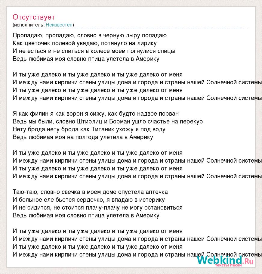 Пропадаю, пропадаю, словно в черную дыру попадаю Как цветочек полевой увядаю, потянуло на лирику И не есться и не спиться в колесе моем погнулися спицы Ведь любимая моя словно птица улетела в Америку И ты уже далеко и ты уже далеко и ты уже далеко от меня И между нами кирпичи стены улицы дома и города и страны нашей Солнечной системы И ты уже далеко и ты уже далеко и ты уже далеко от меня И между нами кирпичи стены улицы дома и города и страны нашей Солнечной системы Я как филин я как ворон я сижу, как будто надвое порван Ведь мы были, словно Штирлиц и Борман ушло счастье на перекур Нету брода нету брода как Титаник ухожу я под воду Ведь любимая моя на полгода улетела в Америку И ты уже далеко и ты уже далеко и ты уже далеко от меня И между нами кирпичи стены улицы дома и города и страны нашей Солнечной системы И ты уже далеко и ты уже далеко и ты уже далеко от меня И между нами кирпичи стены улицы дома и города и страны нашей Солнечной системы Таю-таю, словно свечка в моем доме опустела аптечка И больное еле бьется сердечко, я впадаю в истерику И не сидится, не стоится плачу-плачу не могу остановиться Ведь любимая моя словно птица улетела в Америку И ты уже далеко и ты уже далеко и ты уже далеко от меня И между нами кирпичи стены улицы дома и города и страны нашей Солнечной системы И ты уже далеко и ты уже далеко и ты уже далеко от меня И между нами кирпичи стены улицы дома и города и страны нашей Солнечной системы