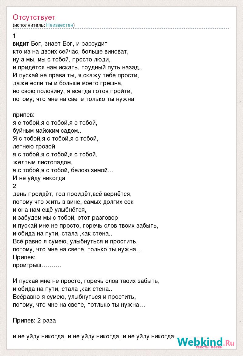 1 видит Бог, знает Бог, и рассудит кто из на двоих сейчас, больше виноват, ну а мы, мы с тобой, просто люди, и придётся нам искать, трудный путь назад.. И пускай не права ты, я скажу тебе прости, даже если ты и больше моего грешна, но свою половину, я всегда готов пройти, потому, что мне на свете только ты нужна припев: я с тобой,я с тобой,я с тобой, буйным майским садом.. Я с тобой,я с тобой,я с тобой, летнею грозой я с тобой,я с тобой,я с тобой, жёлтым листопадом, я с тобой,я с тобой, белою зимой… И не уйду никогда 2 день пройдёт, год пройдёт,всё вернётся, потому что жить в вине, самых долгих сок и она нам ещё улыбнётся, и забудем мы с тобой, этот разговор и пускай мне не просто, горечь слов твоих забыть, и обида на пути, стала ,как стена.. Всё равно я сумею, улыбнуться и простить, потому, что мне на свете, только ты нужна… Припев: проигрыш………. И пускай мне не просто, горечь слов твоих забыть, и обида на пути, стала ,как стена.. Всёравно я сумею, улыбнуться и простить, потому, что мне на свете, тотлько ты нужна… Припев: 2 раза и не уйду никогда, и не уйду никогда, и не уйду никогда…………….