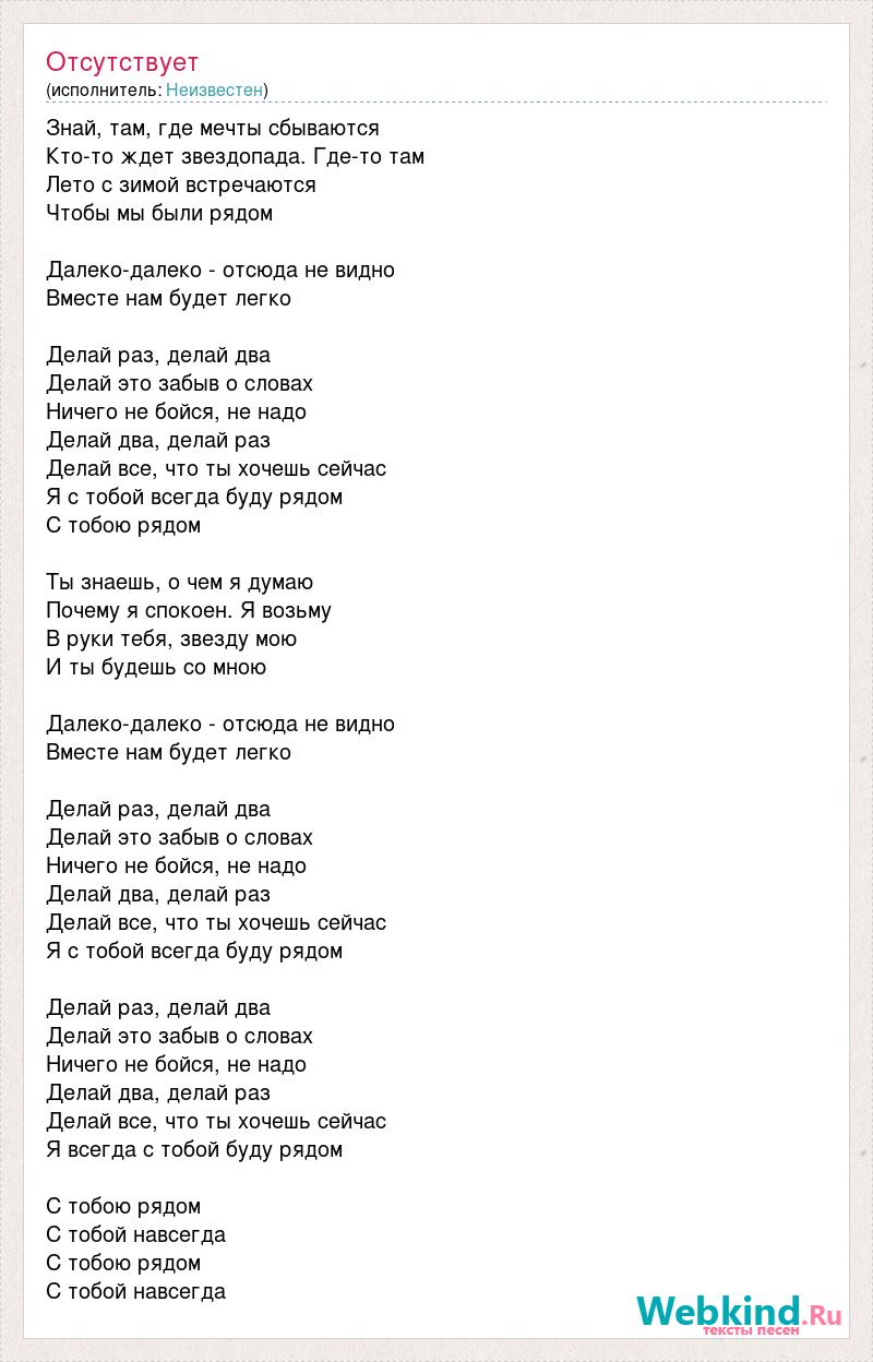 Знай, там, где мечты сбываются Кто-то ждет звездопада. Где-то там Лето с зимой встречаются Чтобы мы были рядом Далеко-далеко - отсюда не видно Вместе нам будет легко Делай раз, делай два Делай это забыв о словах Ничего не бойся, не надо Делай два, делай раз Делай все, что ты хочешь сейчас Я с тобой всегда буду рядом С тобою рядом Ты знаешь, о чем я думаю Почему я спокоен. Я возьму В руки тебя, звезду мою И ты будешь со мною Далеко-далеко - отсюда не видно Вместе нам будет легко Делай раз, делай два Делай это забыв о словах Ничего не бойся, не надо Делай два, делай раз Делай все, что ты хочешь сейчас Я с тобой всегда буду рядом Делай раз, делай два Делай это забыв о словах Ничего не бойся, не надо Делай два, делай раз Делай все, что ты хочешь сейчас Я всегда с тобой буду рядом С тобою рядом С тобой навсегда С тобою рядом С тобой навсегда