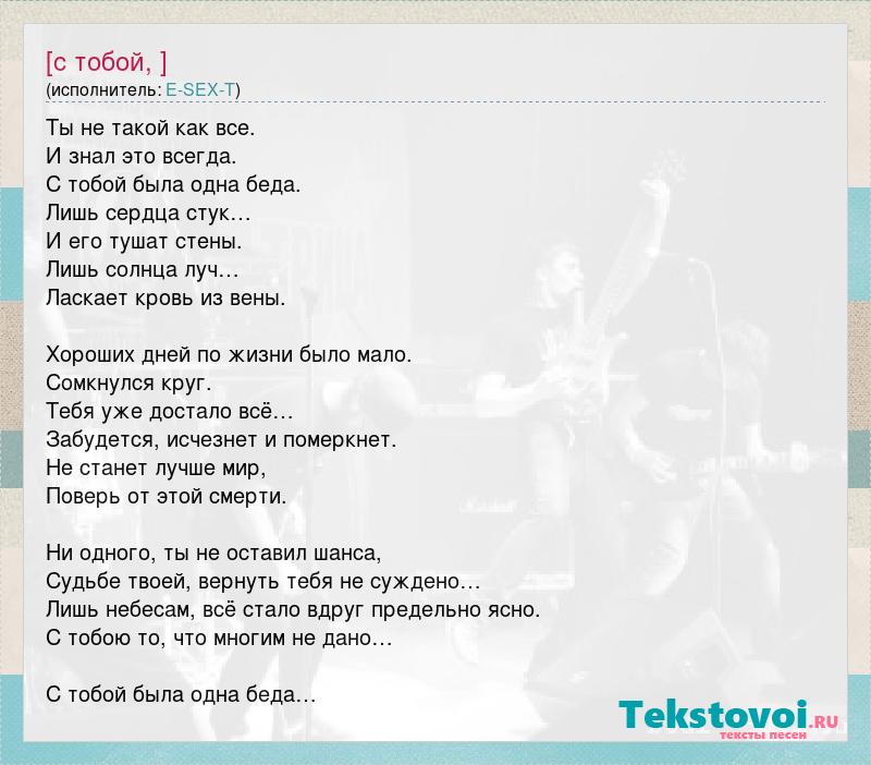 Ты не такой как все. И знал это всегда. С тобой была одна беда. Лишь сердца стук… И его тушат стены. Лишь солнца луч… Ласкает кровь из вены. Хороших дней по жизни было мало. Сомкнулся круг. Тебя уже достало всё… Забудется, исчезнет и померкнет. Не станет лучше мир, Поверь от этой смерти. Ни одного, ты не оставил шанса, Судьбе твоей, вернуть тебя не суждено… Лишь небесам, всё стало вдруг предельно ясно. С тобою то, что многим не дано… С тобой была одна беда…