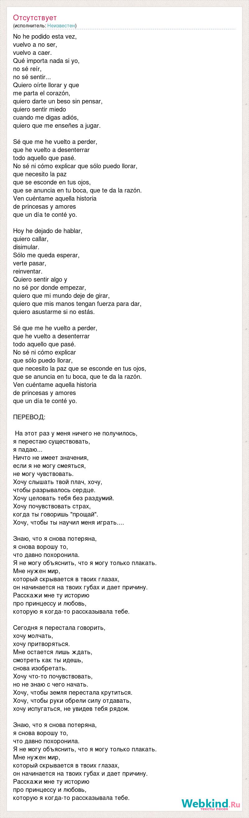 No he podido esta vez, vuelvo a no ser, vuelvo a caer. Qué importa nada si yo, no sé reír, no sé sentir... Quiero oírte llorar y que me parta el corazón, quiero darte un beso sin pensar, quiero sentir miedo cuando me digas adiós, quiero que me enseñes a jugar. Sé que me he vuelto a perder, que he vuelto a desenterrar todo aquello que pasé. No sé ni cómo explicar que sólo puedo llorar, que necesito la paz que se esconde en tus ojos, que se anuncia en tu boca, que te da la razón. Ven cuéntame aquella historia de princesas y amores que un día te conté yo. Hoy he dejado de hablar, quiero callar, disimular. Sólo me queda esperar, verte pasar, reinventar. Quiero sentir algo y no sé por donde empezar, quiero que mi mundo deje de girar, quiero que mis manos tengan fuerza para dar, quiero asustarme si no estás. Sé que me he vuelto a perder, que he vuelto a desenterrar todo aquello que pasé. No sé ni cómo explicar que sólo puedo llorar, que necesito la paz que se esconde en tus ojos, que se anuncia en tu boca, que te da la razón. Ven cuéntame aquella historia de princesas y amores que un día te conté yo. ПЕРЕВОД: На этот раз у меня ничего не получилось, я перестаю существовать, я падаю... Ничто не имеет значения, если я не могу смеяться, не могу чувствовать. Хочу слышать твой плач, хочу, чтобы разрывалось сердце. Хочу целовать тебя без раздумий. Хочу почувствовать страх, когда ты говоришь "прощай". Хочу, чтобы ты научил меня играть.... Знаю, что я снова потеряна, я снова ворошу то, что давно похоронила. Я не могу объяснить, что я могу только плакать. Мне нужен мир, который скрывается в твоих глазах, он начинается на твоих губах и дает причину. Расскажи мне ту историю про принцессу и любовь, которую я когда-то рассказывала тебе. Сегодня я перестала говорить, хочу молчать, хочу притворяться. Мне остается лишь ждать, смотреть как ты идешь, снова изобретать. Хочу что-то почувствовать, но не знаю с чего начать. Хочу, чтобы земля перестала крутиться. Хочу, чтобы руки обрели силу отдавать, хочу испугаться, не увидев тебя рядом. Знаю, что я снова потеряна, я снова ворошу то, что давно похоронила. Я не могу объяснить, что я могу только плакать. Мне нужен мир, который скрывается в твоих глазах, он начинается на твоих губах и дает причину. Расскажи мне ту историю про принцессу и любовь, которую я когда-то рассказывала тебе.