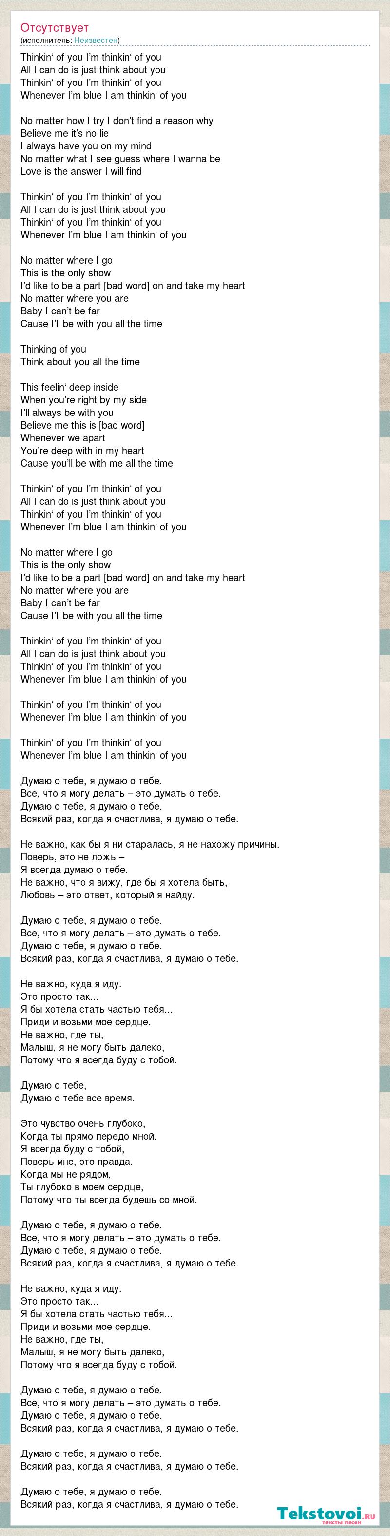 Thinkin‘ of you I’m thinkin‘ of you All I can do is just think about you Thinkin‘ of you I’m thinkin‘ of you Whenever I’m blue I am thinkin‘ of you No matter how I try I don’t find a reason why Believe me it’s no lie I always have you on my mind No matter what I see guess where I wanna be Love is the answer I will find Thinkin‘ of you I’m thinkin‘ of you All I can do is just think about you Thinkin‘ of you I’m thinkin‘ of you Whenever I’m blue I am thinkin‘ of you No matter where I go This is the only show I’d like to be a part [bad word] on and take my heart No matter where you are Baby I can’t be far Cause I’ll be with you all the time Thinking of you Think about you all the time This feelin‘ deep inside When you’re right by my side I’ll always be with you Believe me this is [bad word] Whenever we apart You’re deep with in my heart Cause you’ll be with me all the time Thinkin‘ of you I’m thinkin‘ of you All I can do is just think about you Thinkin‘ of you I’m thinkin‘ of you Whenever I’m blue I am thinkin‘ of you No matter where I go This is the only show I’d like to be a part [bad word] on and take my heart No matter where you are Baby I can’t be far Cause I’ll be with you all the time Thinkin‘ of you I’m thinkin‘ of you All I can do is just think about you Thinkin‘ of you I’m thinkin‘ of you Whenever I’m blue I am thinkin‘ of you Thinkin‘ of you I’m thinkin‘ of you Whenever I’m blue I am thinkin‘ of you Thinkin‘ of you I’m thinkin‘ of you Whenever I’m blue I am thinkin‘ of you Думаю о тебе, я думаю о тебе. Все, что я могу делать – это думать о тебе. Думаю о тебе, я думаю о тебе. Всякий раз, когда я счастлива, я думаю о тебе. Не важно, как бы я ни старалась, я не нахожу причины. Поверь, это не ложь – Я всегда думаю о тебе. Не важно, что я вижу, где бы я хотела быть, Любовь – это ответ, который я найду. Думаю о тебе, я думаю о тебе. Все, что я могу делать – это думать о тебе. Думаю о тебе, я думаю о тебе. Всякий раз, когда я счастлива, я думаю о тебе. Не важно, куда я иду. Это просто так... Я бы хотела стать частью тебя... Приди и возьми мое сердце. Не важно, где ты, Малыш, я не могу быть далеко, Потому что я всегда буду с тобой. Думаю о тебе, Думаю о тебе все время. Это чувство очень глубоко, Когда ты прямо передо мной. Я всегда буду с тобой, Поверь мне, это правда. Когда мы не рядом, Ты глубоко в моем сердце, Потому что ты всегда будешь со мной. Думаю о тебе, я думаю о тебе. Все, что я могу делать – это думать о тебе. Думаю о тебе, я думаю о тебе. Всякий раз, когда я счастлива, я думаю о тебе. Не важно, куда я иду. Это просто так... Я бы хотела стать частью тебя... Приди и возьми мое сердце. Не важно, где ты, Малыш, я не могу быть далеко, Потому что я всегда буду с тобой. Думаю о тебе, я думаю о тебе. Все, что я могу делать – это думать о тебе. Думаю о тебе, я думаю о тебе. Всякий раз, когда я счастлива, я думаю о тебе. Думаю о тебе, я думаю о тебе. Всякий раз, когда я счастлива, я думаю о тебе. Думаю о тебе, я думаю о тебе. Всякий раз, когда я счастлива, я думаю о тебе.