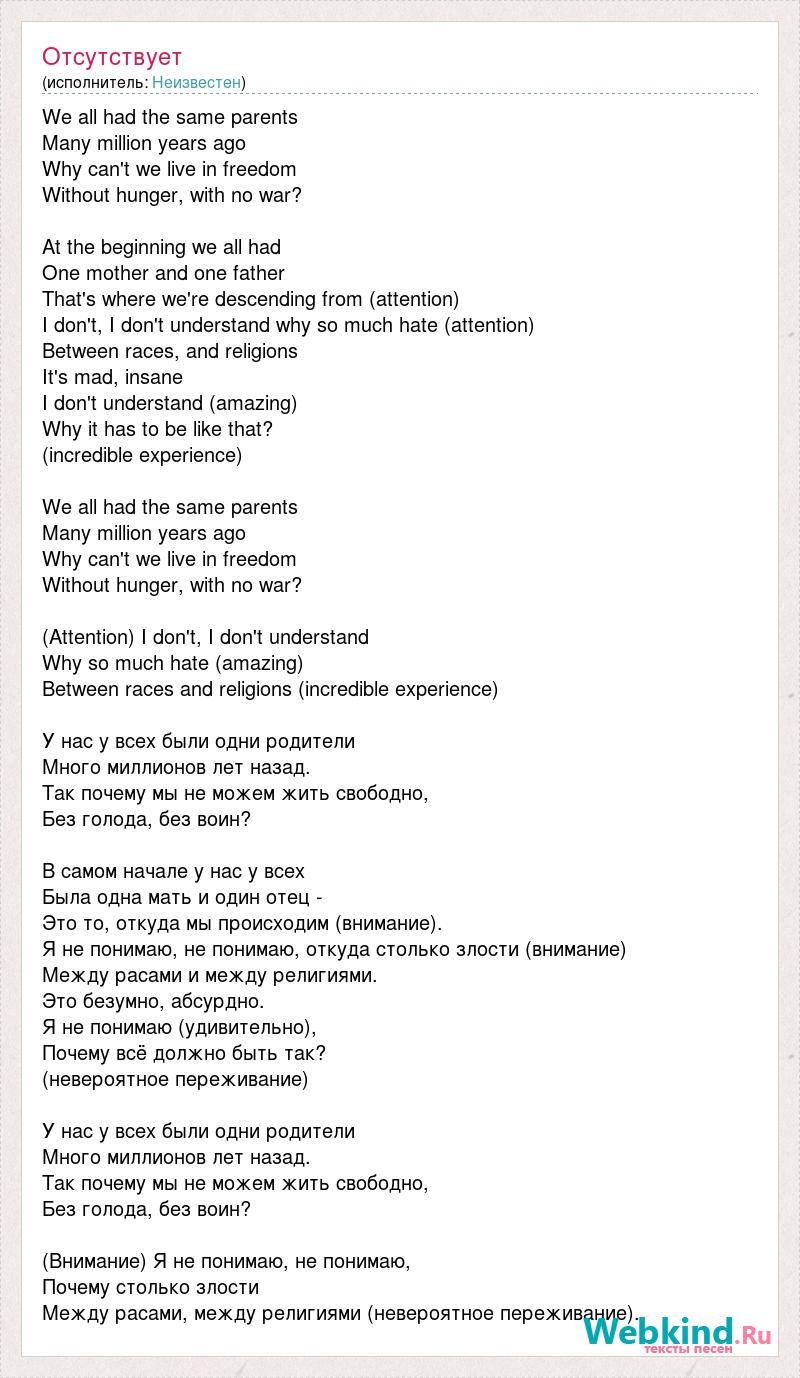 We all had the same parents Many million years ago Why can't we live in freedom Without hunger, with no war? At the beginning we all had One mother and one father That's where we're descending from (attention) I don't, I don't understand why so much hate (attention) Between races, and religions It's mad, insane I don't understand (amazing) Why it has to be like that? (incredible experience) We all had the same parents Many million years ago Why can't we live in freedom Without hunger, with no war? (Attention) I don't, I don't understand Why so much hate (amazing) Between races and religions (incredible experience) У нас у всех были одни родители Много миллионов лет назад. Так почему мы не можем жить свободно, Без голода, без воин? В самом начале у нас у всех Была одна мать и один отец - Это то, откуда мы происходим (внимание). Я не понимаю, не понимаю, откуда столько злости (внимание) Между расами и между религиями. Это безумно, абсурдно. Я не понимаю (удивительно), Почему всё должно быть так? (невероятное переживание) У нас у всех были одни родители Много миллионов лет назад. Так почему мы не можем жить свободно, Без голода, без воин? (Внимание) Я не понимаю, не понимаю, Почему столько злости Между расами, между религиями (невероятное переживание).
