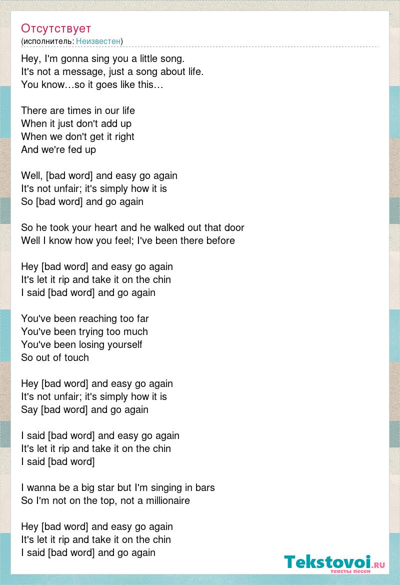 Hey, I'm gonna sing you a little song. It's not a message, just a song about life. You know…so it goes like this… There are times in our life When it just don't add up When we don't get it right And we're fed up Well, [bad word] and easy go again It's not unfair; it's simply how it is So [bad word] and go again So he took your heart and he walked out that door Well I know how you feel; I've been there before Hey [bad word] and easy go again It's let it rip and take it on the chin I said [bad word] and go again You've been reaching too far You've been trying too much You've been losing yourself So out of touch Hey [bad word] and easy go again It's not unfair; it's simply how it is Say [bad word] and go again I said [bad word] and easy go again It's let it rip and take it on the chin I said [bad word] I wanna be a big star but I'm singing in bars So I'm not on the top, not a millionaire Hey [bad word] and easy go again It's let it rip and take it on the chin I said [bad word] and go again