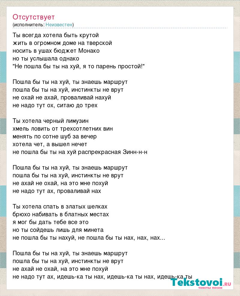 Ты всегда хотела быть крутой жить в огромном доме на тверской носить в ушах бюджет Монако но ты услышала однако "Не пошла бы ты на хуй, я то парень простой!" Пошла бы ты на хуй, ты знаешь маршрут пошла бы ты на хуй, инстинкты не врут не охай не ахай, проваливай нахуй не надо тут ох, ситаю до трех Ты хотела черный лимузин хмель ловить от трехсотлетних вин менять по сотне шуб за вечер хотела чет, а вышел нечет не пошла бы ты на хуй распрекрасная Зинн-н-н Пошла бы ты на хуй, ты знаешь маршрут пошла бы ты на хуй, инстинкты не врут не ахай не охай, на это мне похуй не надо тут ах, проваливай нах Ты хотела спать в златых шелках брюхо набивать в блатных местах я мог бы дать тебе все это но ты сойдешь лишь для минета не пошла бы ты нахуй, не пошла бы ты нах, нах, нах... Пошла бы ты на хуй, ты знаешь маршрут пошла бы ты на хуй, инстинкты не врут не ахай не охай, на это мне похуй не надо тут ах, идешь-ка ты нах, идешь-ка ты нах, идешь-ка ты