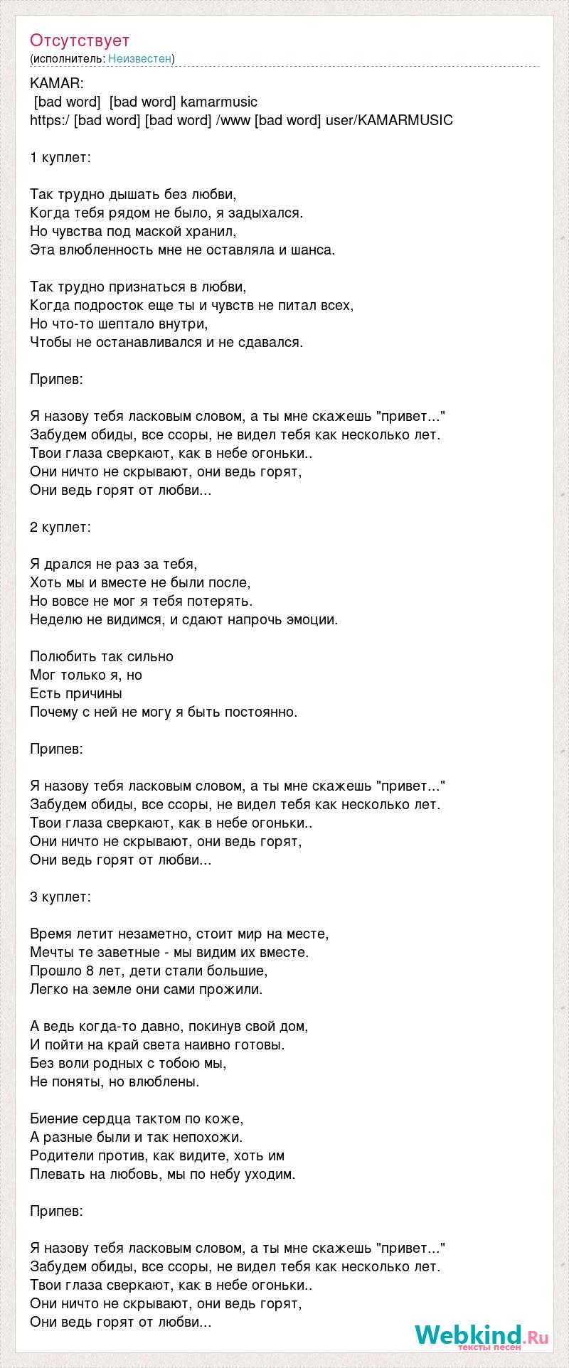 KAMAR: [bad word] [bad word] kamarmusic https:/ [bad word] [bad word] /www [bad word] user/KAMARMUSIC 1 куплет: Так трудно дышать без любви, Когда тебя рядом не было, я задыхался. Но чувства под маской хранил, Эта влюбленность мне не оставляла и шанса. Так трудно признаться в любви, Когда подросток еще ты и чувств не питал всех, Но что-то шептало внутри, Чтобы не останавливался и не сдавался. Припев: Я назову тебя ласковым словом, а ты мне скажешь "привет..." Забудем обиды, все ссоры, не видел тебя как несколько лет. Твои глаза сверкают, как в небе огоньки.. Они ничто не скрывают, они ведь горят, Они ведь горят от любви... 2 куплет: Я дрался не раз за тебя, Хоть мы и вместе не были после, Но вовсе не мог я тебя потерять. Неделю не видимся, и сдают напрочь эмоции. Полюбить так сильно Мог только я, но Есть причины Почему с ней не могу я быть постоянно. Припев: Я назову тебя ласковым словом, а ты мне скажешь "привет..." Забудем обиды, все ссоры, не видел тебя как несколько лет. Твои глаза сверкают, как в небе огоньки.. Они ничто не скрывают, они ведь горят, Они ведь горят от любви... 3 куплет: Время летит незаметно, стоит мир на месте, Мечты те заветные - мы видим их вместе. Прошло 8 лет, дети стали большие, Легко на земле они сами прожили. А ведь когда-то давно, покинув свой дом, И пойти на край света наивно готовы. Без воли родных с тобою мы, Не поняты, но влюблены. Биение сердца тактом по коже, А разные были и так непохожи. Родители против, как видите, хоть им Плевать на любовь, мы по небу уходим. Припев: Я назову тебя ласковым словом, а ты мне скажешь "привет..." Забудем обиды, все ссоры, не видел тебя как несколько лет. Твои глаза сверкают, как в небе огоньки.. Они ничто не скрывают, они ведь горят, Они ведь горят от любви...