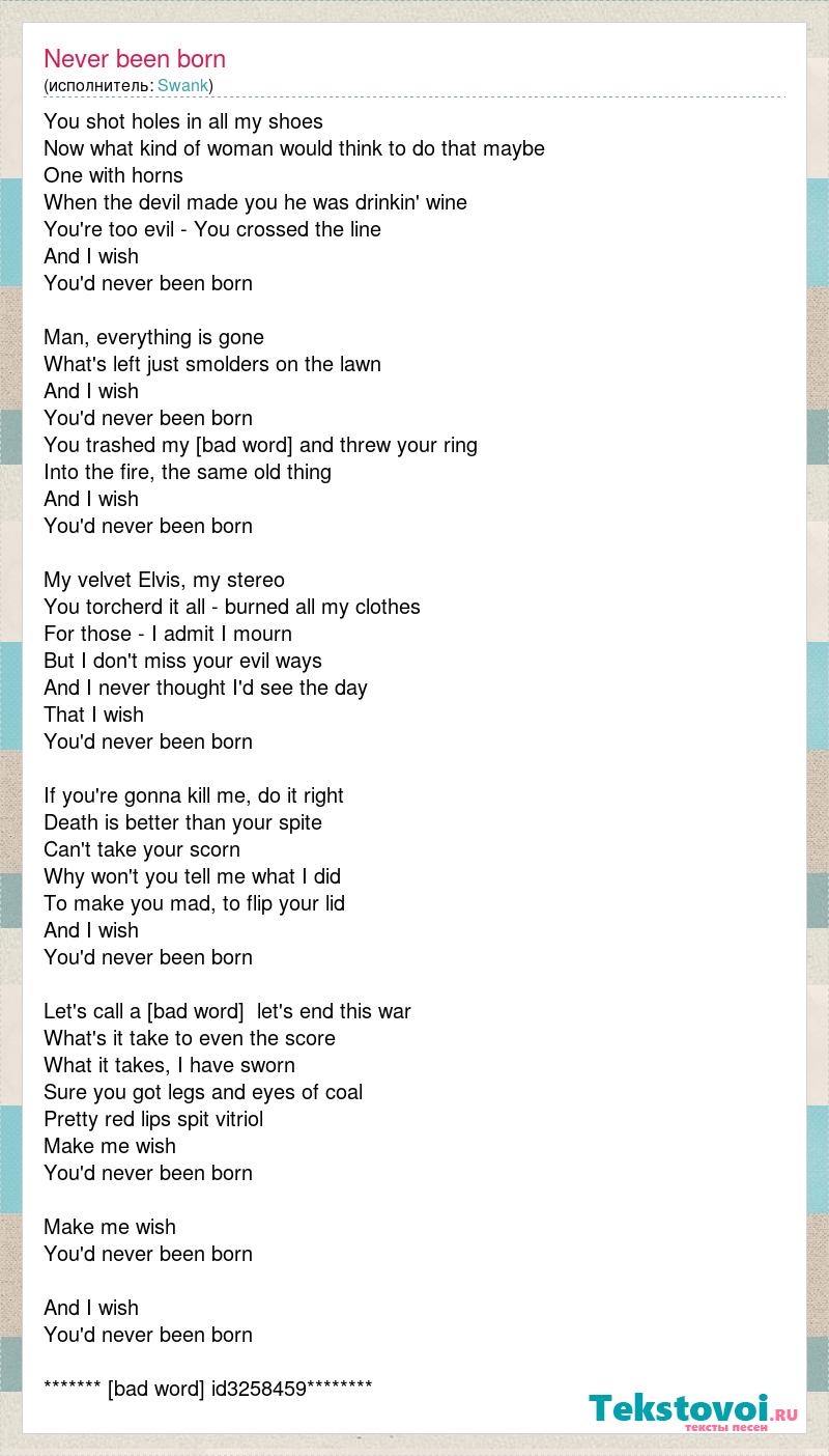 You shot holes in all my shoes Now what kind of woman would think to do that maybe One with horns When the devil made you he was drinkin' wine You're too evil - You crossed the line And I wish You'd never been born Man, everything is gone What's left just smolders on the lawn And I wish You'd never been born You trashed my [bad word] and threw your ring Into the fire, the same old thing And I wish You'd never been born My velvet Elvis, my stereo You torcherd it all - burned all my clothes For those - I admit I mourn But I don't miss your evil ways And I never thought I'd see the day That I wish You'd never been born If you're gonna kill me, do it right Death is better than your spite Can't take your scorn Why won't you tell me what I did To make you mad, to flip your lid And I wish You'd never been born Let's call a [bad word] let's end this war What's it take to even the score What it takes, I have sworn Sure you got legs and eyes of coal Pretty red lips spit vitriol Make me wish You'd never been born Make me wish You'd never been born And I wish You'd never been born ******* [bad word] id3258459********