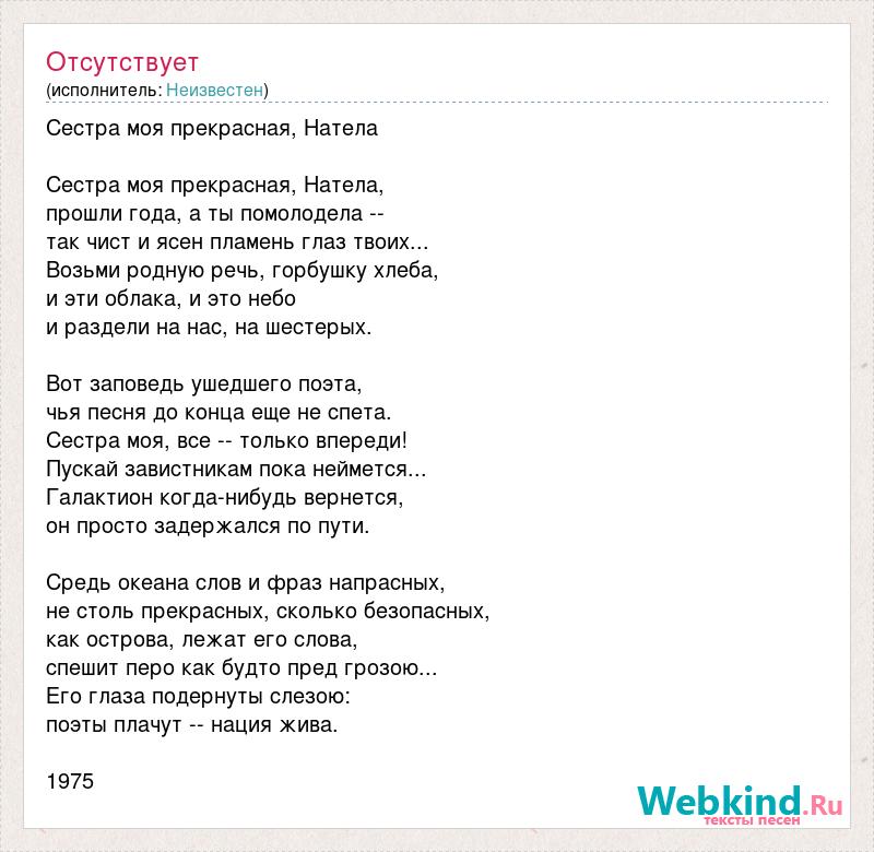 Сестра моя прекрасная, Натела Сестра моя прекрасная, Натела, прошли года, а ты помолодела -- так чист и ясен пламень глаз твоих... Возьми родную речь, горбушку хлеба, и эти облака, и это небо и раздели на нас, на шестерых. Вот заповедь ушедшего поэта, чья песня до конца еще не спета. Сестра моя, все -- только впереди! Пускай завистникам пока неймется... Галактион когда-нибудь вернется, он просто задержался по пути. Средь океана слов и фраз напрасных, не столь прекрасных, сколько безопасных, как острова, лежат его слова, спешит перо как будто пред грозою... Его глаза подернуты слезою: поэты плачут -- нация жива. 1975