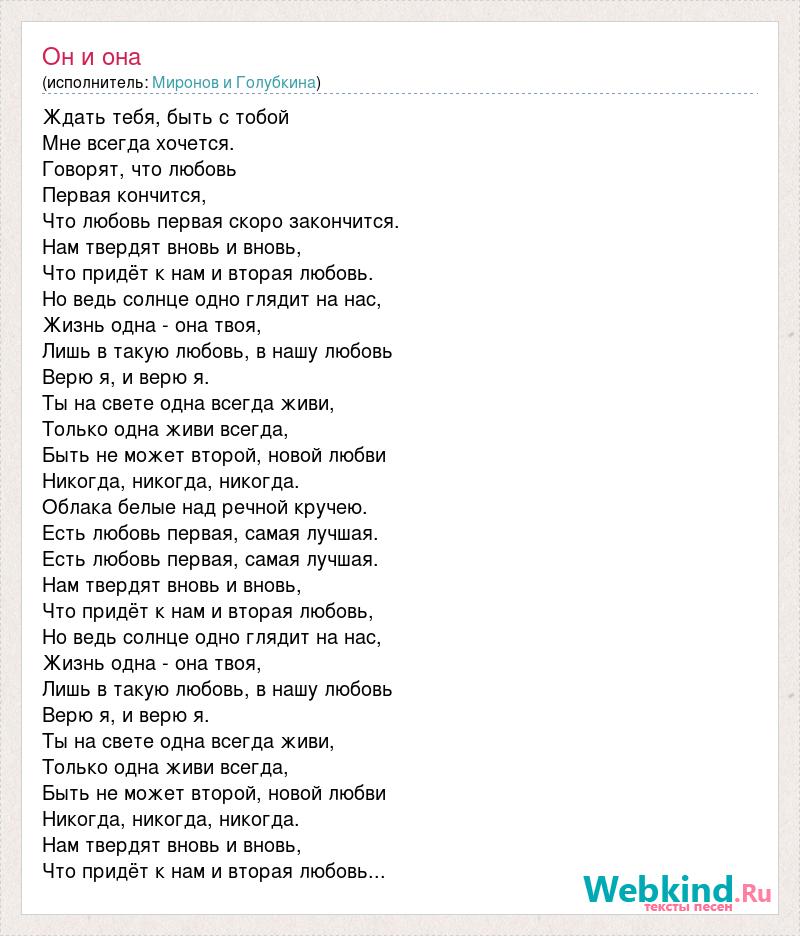 Ждать тебя, быть с тобой Мне всегда хочется. Говорят, что любовь Первая кончится, Что любовь первая скоро закончится. Нам твердят вновь и вновь, Что придёт к нам и вторая любовь. Но ведь солнце одно глядит на нас, Жизнь одна - она твоя, Лишь в такую любовь, в нашу любовь Верю я, и верю я. Ты на свете одна всегда живи, Только одна живи всегда, Быть не может второй, новой любви Никогда, никогда, никогда. Облака белые над речной кручею. Есть любовь первая, самая лучшая. Есть любовь первая, самая лучшая. Нам твердят вновь и вновь, Что придёт к нам и вторая любовь, Но ведь солнце одно глядит на нас, Жизнь одна - она твоя, Лишь в такую любовь, в нашу любовь Верю я, и верю я. Ты на свете одна всегда живи, Только одна живи всегда, Быть не может второй, новой любви Никогда, никогда, никогда. Нам твердят вновь и вновь, Что придёт к нам и вторая любовь...