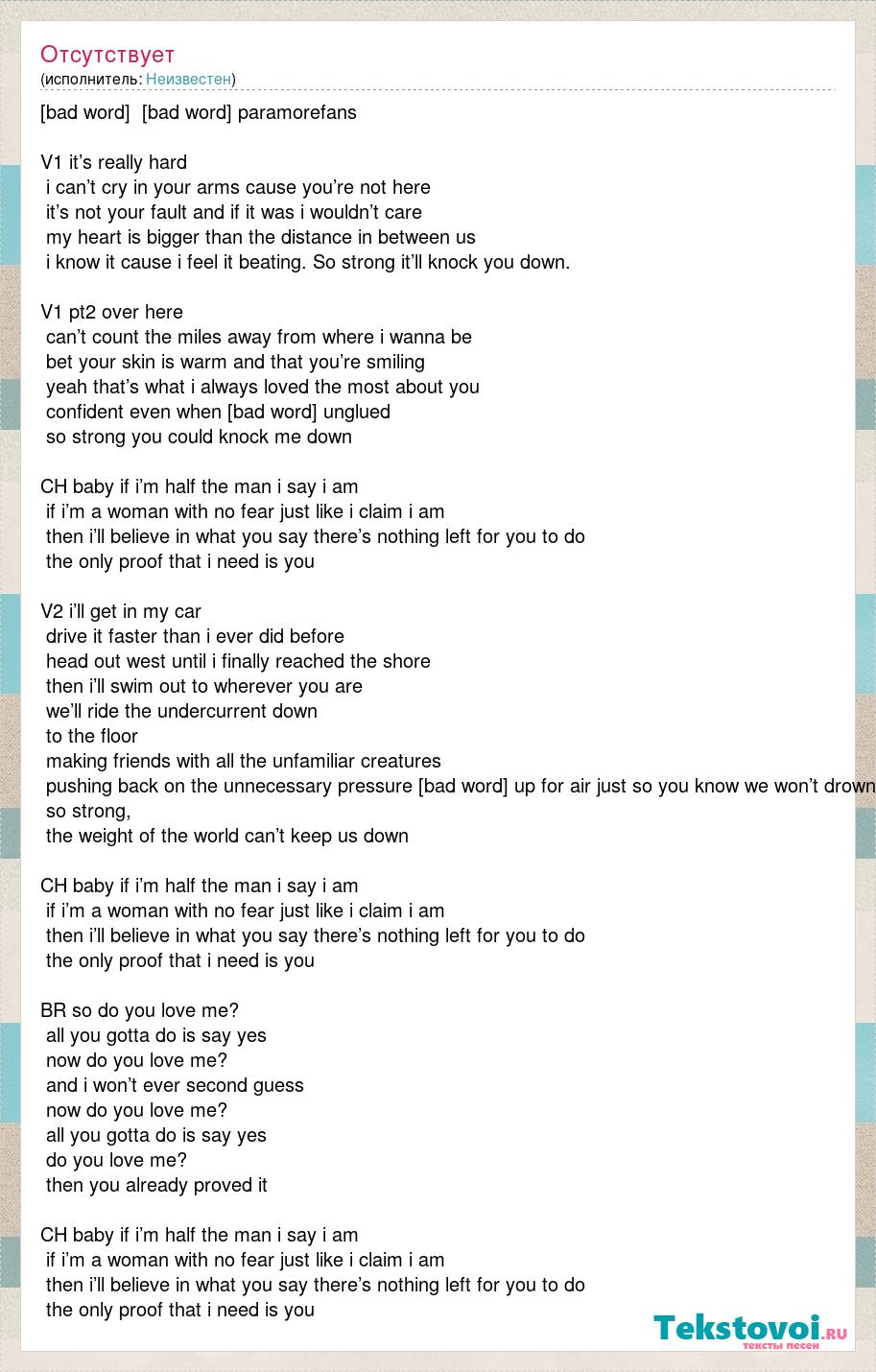 [bad word] [bad word] paramorefans V1 it’s really hard i can’t cry in your arms cause you’re not here it’s not your fault and if it was i wouldn’t care my heart is bigger than the distance in between us i know it cause i feel it beating. So strong it’ll knock you down. V1 pt2 over here can’t count the miles away from where i wanna be bet your skin is warm and that you’re smiling yeah that’s what i always loved the most about you confident even when [bad word] unglued so strong you could knock me down CH baby if i’m half the man i say i am if i’m a woman with no fear just like i claim i am then i’ll believe in what you say there’s nothing left for you to do the only proof that i need is you V2 i’ll get in my car drive it faster than i ever did before head out west until i finally reached the shore then i’ll swim out to wherever you are we’ll ride the undercurrent down to the floor making friends with all the unfamiliar creatures pushing back on the unnecessary pressure [bad word] up for air just so you know we won’t drown so strong, the weight of the world can’t keep us down CH baby if i’m half the man i say i am if i’m a woman with no fear just like i claim i am then i’ll believe in what you say there’s nothing left for you to do the only proof that i need is you BR so do you love me? all you gotta do is say yes now do you love me? and i won’t ever second guess now do you love me? all you gotta do is say yes do you love me? then you already proved it CH baby if i’m half the man i say i am if i’m a woman with no fear just like i claim i am then i’ll believe in what you say there’s nothing left for you to do the only proof that i need is you