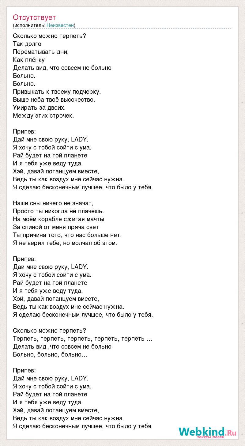 Сколько можно терпеть? Так долго Перематывать дни, Как плёнку Делать вид, что совсем не больно Больно. Больно. Привыкать к твоему подчерку. Выше неба твоё высочество. Умирать за двоих. Между этих строчек. Припев: Дай мне свою руку, LADY. Я хочу с тобой сойти с ума. Рай будет на той планете И я тебя уже веду туда. Хэй, давай потанцуем вместе, Ведь ты как воздух мне сейчас нужна. Я сделаю бесконечным лучшее, что было у тебя. Наши сны ничего не значат, Просто ты никогда не плачешь. На моём корабле сжигая мачты За спиной от меня пряча свет Ты причина того, что нас больше нет. Я не верил тебе, но молчал об этом. Припев: Дай мне свою руку, LADY. Я хочу с тобой сойти с ума. Рай будет на той планете И я тебя уже веду туда. Хэй, давай потанцуем вместе, Ведь ты как воздух мне сейчас нужна. Я сделаю бесконечным лучшее, что было у тебя. Сколько можно терпеть? Терпеть, терпеть, терпеть, терпеть, терпеть … Делать вид ,что совсем не больно Больно, больно, больно… Припев: Дай мне свою руку, LADY. Я хочу с тобой сойти с ума. Рай будет на той планете И я тебя уже веду туда. Хэй, давай потанцуем вместе, Ведь ты как воздух мне сейчас нужна. Я сделаю бесконечным лучшее, что было у тебя