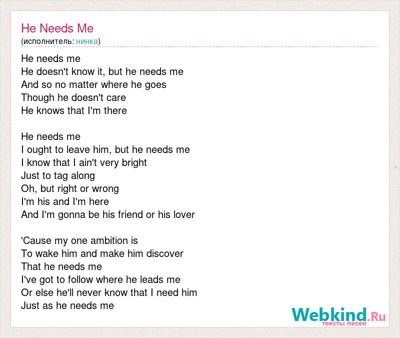 He needs me He doesn't know it, but he needs me And so no matter where he goes Though he doesn't care He knows that I'm there He needs me I ought to leave him, but he needs me I know that I ain't very bright Just to tag along Oh, but right or wrong I'm his and I'm here And I'm gonna be his friend or his lover 'Cause my one ambition is To wake him and make him discover That he needs me I've got to follow where he leads me Or else he'll never know that I need him Just as he needs me