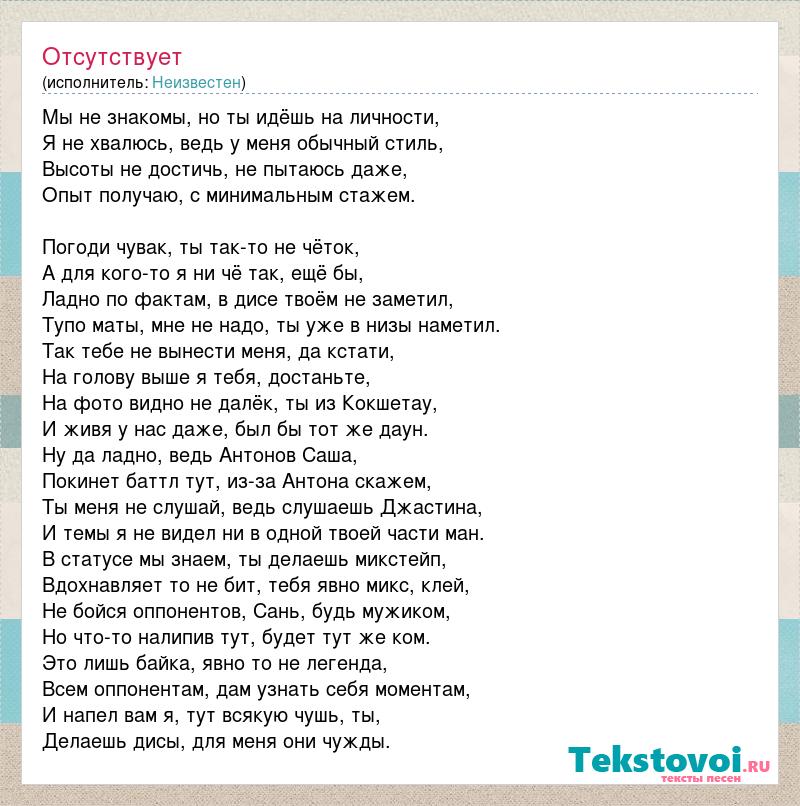 Мы не знакомы, но ты идёшь на личности, Я не хвалюсь, ведь у меня обычный стиль, Высоты не достичь, не пытаюсь даже, Опыт получаю, с минимальным стажем. Погоди чувак, ты так-то не чёток, А для кого-то я ни чё так, ещё бы, Ладно по фактам, в дисе твоём не заметил, Тупо маты, мне не надо, ты уже в низы наметил. Так тебе не вынести меня, да кстати, На голову выше я тебя, достаньте, На фото видно не далёк, ты из Кокшетау, И живя у нас даже, был бы тот же даун. Ну да ладно, ведь Антонов Саша, Покинет баттл тут, из-за Антона скажем, Ты меня не слушай, ведь слушаешь Джастина, И темы я не видел ни в одной твоей части ман. В статусе мы знаем, ты делаешь микстейп, Вдохнавляет то не бит, тебя явно микс, клей, Не бойся оппонентов, Сань, будь мужиком, Но что-то налипив тут, будет тут же ком. Это лишь байка, явно то не легенда, Всем оппонентам, дам узнать себя моментам, И напел вам я, тут всякую чушь, ты, Делаешь дисы, для меня они чужды.