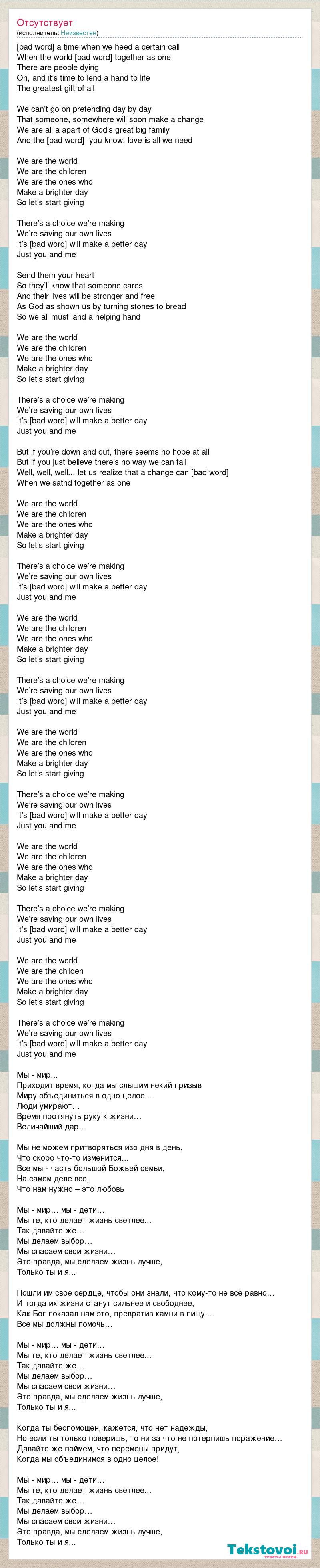 [bad word] a time when we heed a certain call When the world [bad word] together as one There are people dying Oh, and it’s time to lend a hand to life The greatest gift of all We can’t go on pretending day by day That someone, somewhere will soon make a change We are all a apart of God’s great big family And the [bad word] you know, love is all we need We are the world We are the children We are the ones who Make a brighter day So let’s start giving There’s a choice we’re making We’re saving our own lives It’s [bad word] will make a better day Just you and me Send them your heart So they’ll know that someone cares And their lives will be stronger and free As God as shown us by turning stones to bread So we all must land a helping hand We are the world We are the children We are the ones who Make a brighter day So let’s start giving There’s a choice we’re making We’re saving our own lives It’s [bad word] will make a better day Just you and me But if you’re down and out, there seems no hope at all But if you just believe there’s no way we can fall Well, well, well... let us realize that a change can [bad word] When we satnd together as one We are the world We are the children We are the ones who Make a brighter day So let’s start giving There’s a choice we’re making We’re saving our own lives It’s [bad word] will make a better day Just you and me We are the world We are the children We are the ones who Make a brighter day So let’s start giving There’s a choice we’re making We’re saving our own lives It’s [bad word] will make a better day Just you and me We are the world We are the children We are the ones who Make a brighter day So let’s start giving There’s a choice we’re making We’re saving our own lives It’s [bad word] will make a better day Just you and me We are the world We are the children We are the ones who Make a brighter day So let’s start giving There’s a choice we’re making We’re saving our own lives It’s [bad word] will make a better day Just you and me We are the world We are the childen We are the ones who Make a brighter day So let’s start giving There’s a choice we’re making We’re saving our own lives It’s [bad word] will make a better day Just you and me Мы - мир... Приходит время, когда мы слышим некий призыв Миру объединиться в одно целое.... Люди умирают… Время протянуть руку к жизни… Величайший дар… Мы не можем притворяться изо дня в день, Что скоро что-то изменится... Все мы - часть большой Божьей семьи, На самом деле все, Что нам нужно – это любовь Мы - мир… мы - дети… Мы те, кто делает жизнь светлее... Так давайте же… Мы делаем выбор… Мы спасаем свои жизни… Это правда, мы сделаем жизнь лучше, Только ты и я... Пошли им свое сердце, чтобы они знали, что кому-то не всё равно… И тогда их жизни станут сильнее и свободнее, Как Бог показал нам это, превратив камни в пищу.... Все мы должны помочь… Мы - мир… мы - дети… Мы те, кто делает жизнь светлее... Так давайте же… Мы делаем выбор… Мы спасаем свои жизни… Это правда, мы сделаем жизнь лучше, Только ты и я... Когда ты беспомощен, кажется, что нет надежды, Но если ты только поверишь, то ни за что не потерпишь поражение… Давайте же поймем, что перемены придут, Когда мы объединимся в одно целое! Мы - мир… мы - дети… Мы те, кто делает жизнь светлее... Так давайте же… Мы делаем выбор… Мы спасаем свои жизни… Это правда, мы сделаем жизнь лучше, Только ты и я...