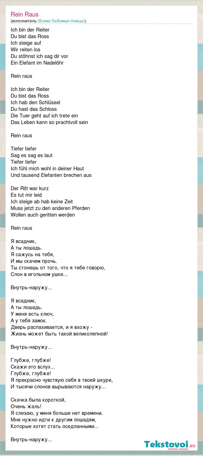 Ich bin der Reiter Du bist das Ross Ich steige auf Wir reiten los Du stöhnst ich sag dir vor Ein Elefant im Nadelöhr Rein raus Ich bin der Reiter Du bist das Ross Ich hab den Schlüssel Du hast das Schloss Die Tuer geht auf ich trete ein Das Leben kann so prachtvoll sein Rein raus Tiefer tiefer Sag es sag es laut Tiefer tiefer Ich fühl mich wohl in deiner Haut Und tausend Elefanten brechen aus Der Ritt war kurz Es tut mir leid Ich steige ab hab keine Zeit Muss jetzt zu den anderen Pferden Wollen auch geritten werden Rein raus Я всадник, А ты лошадь. Я сажусь на тебя, И мы скачем прочь. Ты стонешь от того, что я тебе говорю, Слон в игольном ушке... Внутрь-наружу... Я всадник, А ты лошадь. У меня есть ключ, А у тебя замок. Дверь распахивается, и я вхожу - Жизнь может быть такой великолепной! Внутрь-наружу... Глубже, глубже! Скажи это вслух... Глубже, глубже! Я прекрасно чувствую себя в твоей шкуре, И тысячи слонов вырываются наружу... Скачка была короткой, Очень жаль! Я слезаю, у меня больше нет времени. Мне нужно идти к другим лошадям, Которые хотят стать оседланными... Внутрь-наружу...