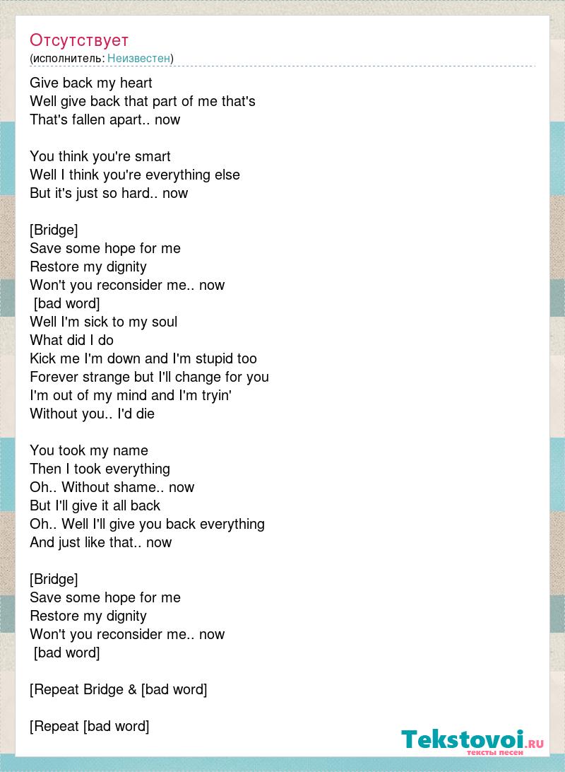 Give back my heart Well give back that part of me that's That's fallen apart.. now You think you're smart Well I think you're everything else But it's just so hard.. now [Bridge] Save some hope for me Restore my dignity Won't you reconsider me.. now [bad word] Well I'm sick to my soul What did I do Kick me I'm down and I'm stupid too Forever strange but I'll change for you I'm out of my mind and I'm tryin' Without you.. I'd die You took my name Then I took everything Oh.. Without shame.. now But I'll give it all back Oh.. Well I'll give you back everything And just like that.. now [Bridge] Save some hope for me Restore my dignity Won't you reconsider me.. now [bad word] [Repeat Bridge & [bad word] [Repeat [bad word]