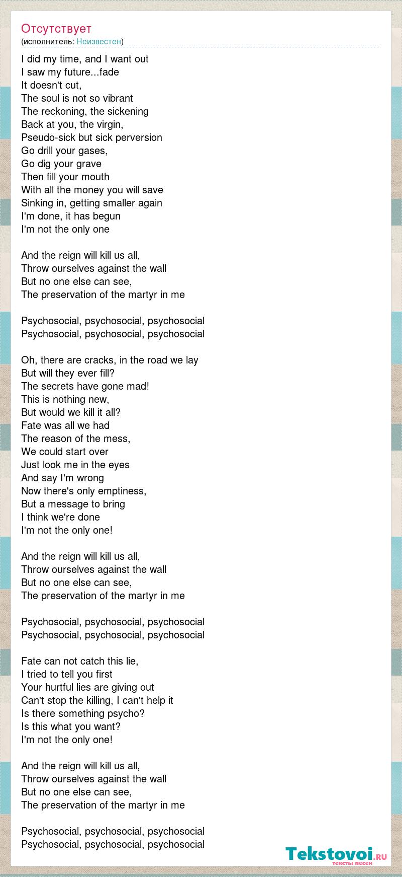 I did my time, and I want out I saw my future...fade It doesn't cut, The soul is not so vibrant The reckoning, the sickening Back at you, the virgin, Pseudo-sick but sick perversion Go drill your gases, Go dig your grave Then fill your mouth With all the money you will save Sinking in, getting smaller again I'm done, it has begun I'm not the only one And the reign will kill us all, Throw ourselves against the wall But no one else can see, The preservation of the martyr in me Psychosocial, psychosocial, psychosocial Psychosocial, psychosocial, psychosocial Oh, there are cracks, in the road we lay But will they ever fill? The secrets have gone mad! This is nothing new, But would we kill it all? Fate was all we had The reason of the mess, We could start over Just look me in the eyes And say I'm wrong Now there's only emptiness, But a message to bring I think we're done I'm not the only one! And the reign will kill us all, Throw ourselves against the wall But no one else can see, The preservation of the martyr in me Psychosocial, psychosocial, psychosocial Psychosocial, psychosocial, psychosocial Fate can not catch this lie, I tried to tell you first Your hurtful lies are giving out Can't stop the killing, I can't help it Is there something psycho? Is this what you want? I'm not the only one! And the reign will kill us all, Throw ourselves against the wall But no one else can see, The preservation of the martyr in me Psychosocial, psychosocial, psychosocial Psychosocial, psychosocial, psychosocial