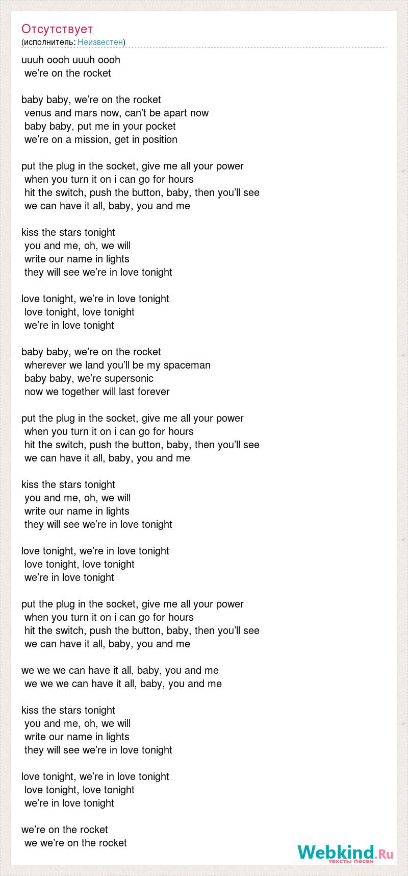 uuuh oooh uuuh oooh we’re on the rocket baby baby, we’re on the rocket venus and mars now, can’t be apart now baby baby, put me in your pocket we’re on a mission, get in position put the plug in the socket, give me all your power when you turn it on i can go for hours hit the switch, push the button, baby, then you’ll see we can have it all, baby, you and me kiss the stars tonight you and me, oh, we will write our name in lights they will see we’re in love tonight love tonight, we’re in love tonight love tonight, love tonight we’re in love tonight baby baby, we’re on the rocket wherever we land you’ll be my spaceman baby baby, we’re supersonic now we together will last forever put the plug in the socket, give me all your power when you turn it on i can go for hours hit the switch, push the button, baby, then you’ll see we can have it all, baby, you and me kiss the stars tonight you and me, oh, we will write our name in lights they will see we’re in love tonight love tonight, we’re in love tonight love tonight, love tonight we’re in love tonight put the plug in the socket, give me all your power when you turn it on i can go for hours hit the switch, push the button, baby, then you’ll see we can have it all, baby, you and me we we we can have it all, baby, you and me we we we can have it all, baby, you and me kiss the stars tonight you and me, oh, we will write our name in lights they will see we’re in love tonight love tonight, we’re in love tonight love tonight, love tonight we’re in love tonight we’re on the rocket we we’re on the rocket
