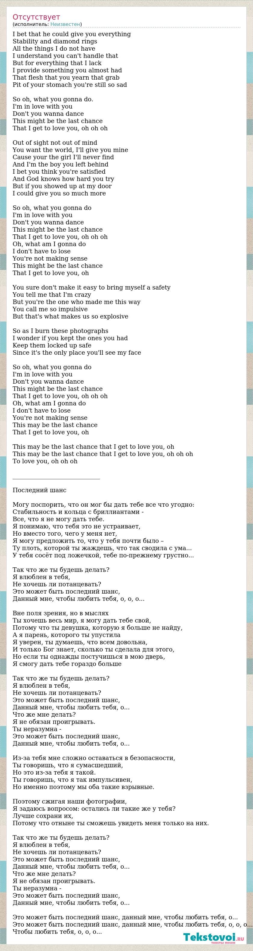 I bet that he could give you everything Stability and diamond rings All the things I do not have I understand you can't handle that But for everything that I lack I provide something you almost had That flesh that you yearn that grab Pit of your stomach you're still so sad So oh, what you gonna do. I'm in love with you Don't you wanna dance This might be the last chance That I get to love you, oh oh oh Out of sight not out of mind You want the world, I'll give you mine Cause your the girl I'll never find And I'm the boy you left behind I bet you think you're satisfied And God knows how hard you try But if you showed up at my door I could give you so much more So oh, what you gonna do I'm in love with you Don't you wanna dance This might be the last chance That I get to love you, oh oh oh Oh, what am I gonna do I don't have to lose You're not making sense This might be the last chance That I get to love you, oh You sure don't make it easy to bring myself a safety You tell me that I'm crazy But you're the one who made me this way You call me so impulsive But that's what makes us so explosive So as I burn these photographs I wonder if you kept the ones you had Keep them locked up safe Since it's the only place you'll see my face So oh, what you gonna do I'm in love with you Don't you wanna dance This might be the last chance That I get to love you, oh oh oh Oh, what am I gonna do I don't have to lose You're not making sense This may be the last chance That I get to love you, oh This may be the last chance that I get to love you, oh This may be the last chance that I get to love you, oh oh oh To love you, oh oh oh _____________________________ Последний шанс Могу поспорить, что он мог бы дать тебе все что угодно: Стабильность и кольца с бриллиантами - Все, что я не могу дать тебе. Я понимаю, что тебя это не устраивает, Но вместо того, чего у меня нет, Я могу предложить то, что у тебя почти было – Ту плоть, которой ты жаждешь, что так сводила с ума... У тебя сосёт под ложечкой, тебе по-прежнему грустно... Так что же ты будешь делать? Я влюблен в тебя, Не хочешь ли потанцевать? Это может быть последний шанс, Данный мне, чтобы любить тебя, о, о, о... Вне поля зрения, но в мыслях Ты хочешь весь мир, я могу дать тебе свой, Потому что ты девушка, которую я больше не найду, А я парень, которого ты упустила Я уверен, ты думаешь, что всем довольна, И только Бог знает, сколько ты сделала для этого, Но если ты однажды постучишься в мою дверь, Я смогу дать тебе гораздо больше Так что же ты будешь делать? Я влюблен в тебя, Не хочешь ли потанцевать? Это может быть последний шанс, Данный мне, чтобы любить тебя, о... Что же мне делать? Я не обязан проигрывать. Ты неразумна - Это может быть последний шанс, Данный мне, чтобы любить тебя, о... Из-за тебя мне сложно оставаться в безопасности, Ты говоришь, что я сумасшедший, Но это из-за тебя я такой. Ты говоришь, что я так импульсивен, Но именно поэтому мы оба такие взрывные. Поэтому сжигая наши фотографии, Я задаюсь вопросом: остались ли такие же у тебя? Лучше сохрани их, Потому что отныне ты сможешь увидеть меня только на них. Так что же ты будешь делать? Я влюблен в тебя, Не хочешь ли потанцевать? Это может быть последний шанс, Данный мне, чтобы любить тебя, о... Что же мне делать? Я не обязан проигрывать. Ты неразумна - Это может быть последний шанс, Данный мне, чтобы любить тебя, о... Это может быть последний шанс, данный мне, чтобы любить тебя, о... Это может быть последний шанс, данный мне, чтобы любить тебя, о, о, о... Чтобы любить тебя, о, о, о...