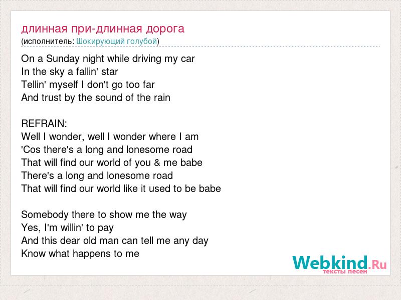 On a Sunday night while driving my car In the sky a fallin' star Tellin' myself I don't go too far And [bad word] by the sound of the rain REFRAIN: Well I wonder, well I wonder where I am 'Cos there's a long and lonesome road That will find our world of you & me babe There's a long and lonesome road That will find our world like it used to be babe Somebody there to show me the way Yes, I'm willin' to pay And this dear old man can tell me any day Know what happens to me