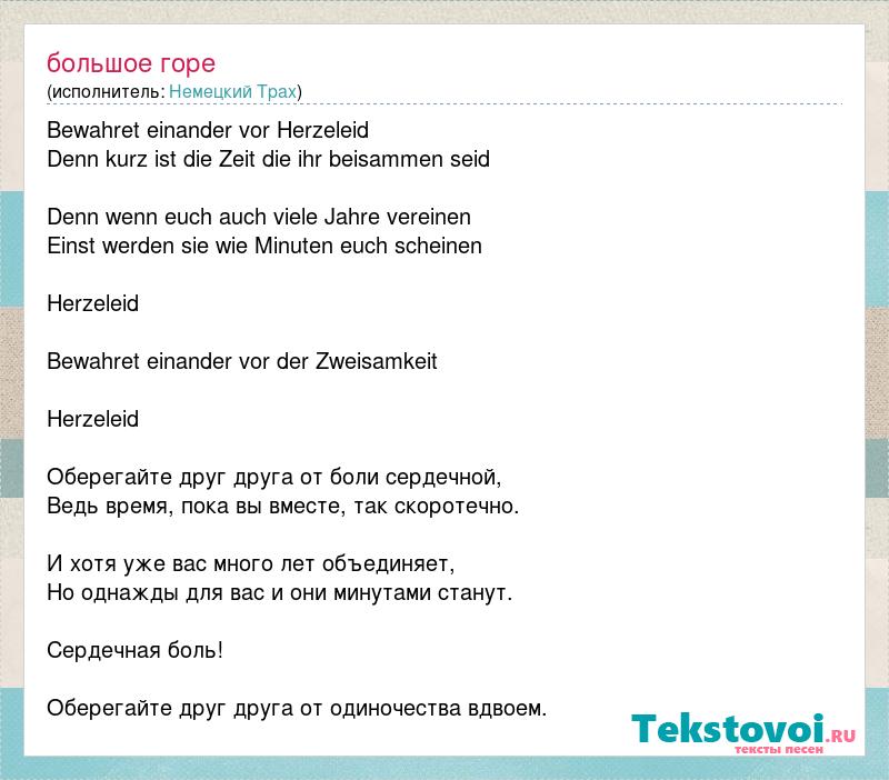 Bewahret einander vor Herzeleid Denn kurz ist die Zeit die ihr beisammen seid Denn wenn euch auch viele Jahre vereinen Einst werden sie wie Minuten euch scheinen Herzeleid Bewahret einander vor der Zweisamkeit Herzeleid Оберегайте друг друга от боли сердечной, Ведь время, пока вы вместе, так скоротечно. И хотя уже вас много лет объединяет, Но однажды для вас и они минутами станут. Сердечная боль! Оберегайте друг друга от одиночества вдвоем.