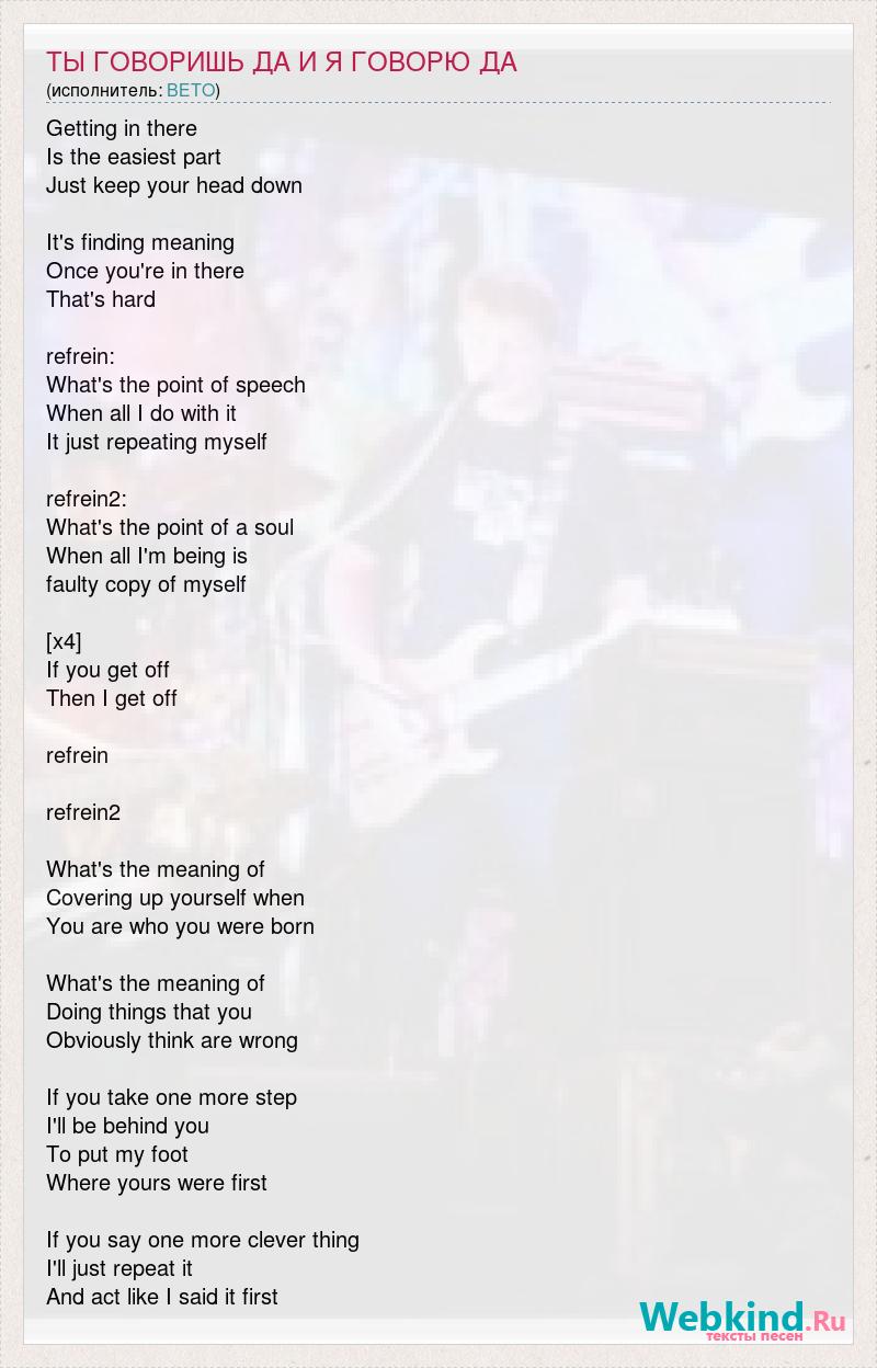 Getting in there Is the easiest part Just keep your head down It's finding meaning Once you're in there That's hard refrein: What's the point of speech When all I do with it It just repeating myself refrein2: What's the point of a soul When all I'm being is faulty copy of myself [x4] If you get off Then I get off refrein refrein2 What's the meaning of Covering up yourself when You are who you were born What's the meaning of Doing things that you Obviously think are wrong If you take one more step I'll be behind you To put my foot Where yours were first If you say one more clever thing I'll just repeat it And act like I said it first