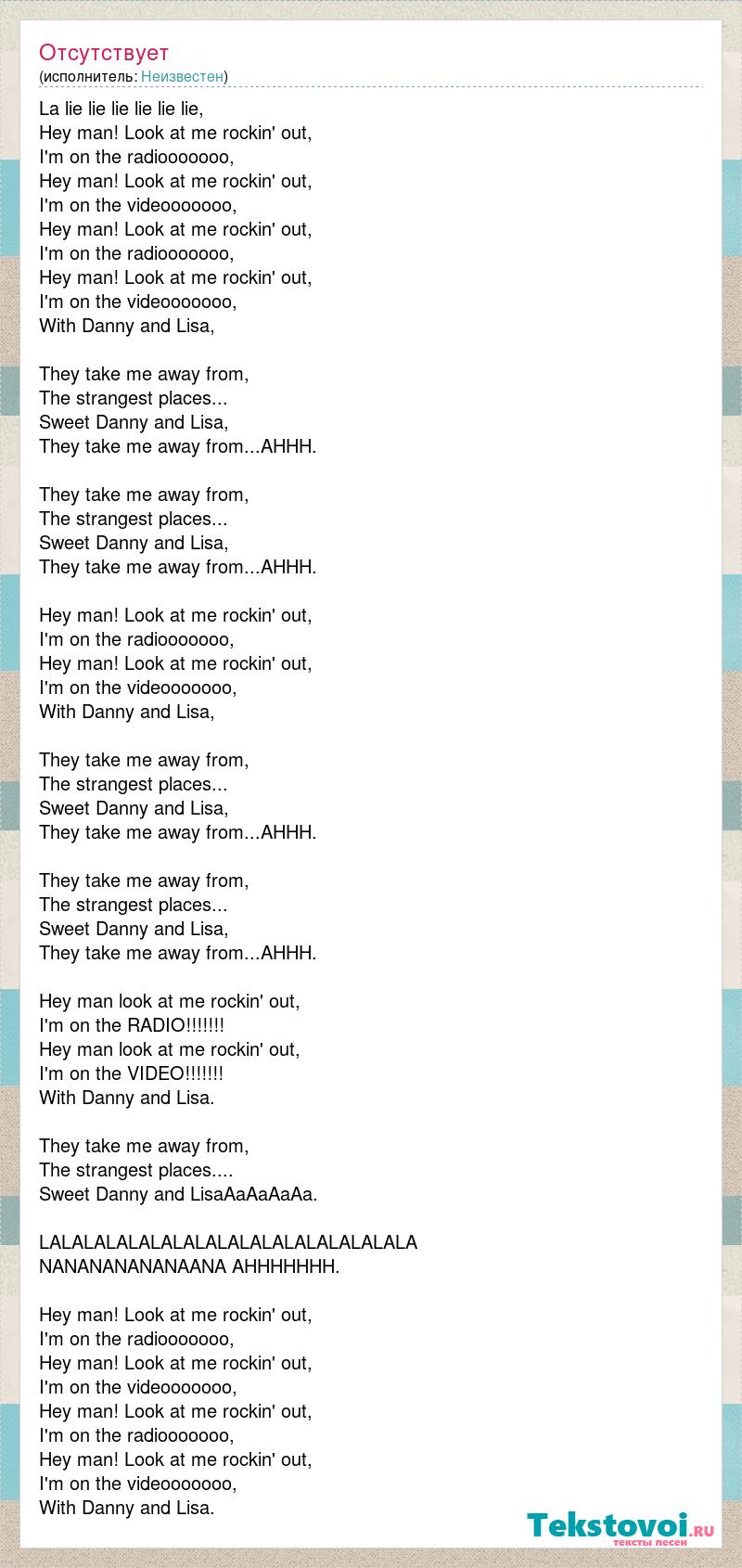 La lie lie lie lie lie lie, Hey man! Look at me rockin' out, I'm on the radiooooooo, Hey man! Look at me rockin' out, I'm on the videooooooo, Hey man! Look at me rockin' out, I'm on the radiooooooo, Hey man! Look at me rockin' out, I'm on the videooooooo, With Danny and Lisa, They take me away from, The strangest places... Sweet Danny and Lisa, They take me away from...AHHH. They take me away from, The strangest places... Sweet Danny and Lisa, They take me away from...AHHH. Hey man! Look at me rockin' out, I'm on the radiooooooo, Hey man! Look at me rockin' out, I'm on the videooooooo, With Danny and Lisa, They take me away from, The strangest places... Sweet Danny and Lisa, They take me away from...AHHH. They take me away from, The strangest places... Sweet Danny and Lisa, They take me away from...AHHH. Hey man look at me rockin' out, I'm on the RADIO!!!!!!! Hey man look at me rockin' out, I'm on the VIDEO!!!!!!! With Danny and Lisa. They take me away from, The strangest places.... Sweet Danny and LisaAaAaAaAa. LALALALALALALALALALALALALALALALALA NANANANANANAANA AHHHHHHH. Hey man! Look at me rockin' out, I'm on the radiooooooo, Hey man! Look at me rockin' out, I'm on the videooooooo, Hey man! Look at me rockin' out, I'm on the radiooooooo, Hey man! Look at me rockin' out, I'm on the videooooooo, With Danny and Lisa.