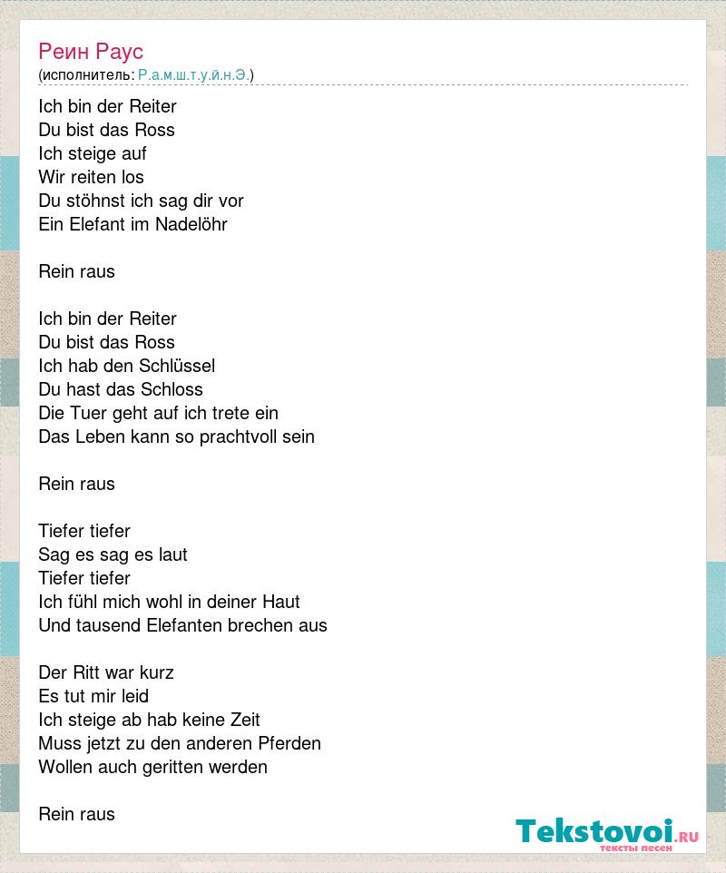 Ich bin der Reiter Du bist das Ross Ich steige auf Wir reiten los Du stöhnst ich sag dir vor Ein Elefant im Nadelöhr Rein raus Ich bin der Reiter Du bist das Ross Ich hab den Schlüssel Du hast das Schloss Die Tuer geht auf ich trete ein Das Leben kann so prachtvoll sein Rein raus Tiefer tiefer Sag es sag es laut Tiefer tiefer Ich fühl mich wohl in deiner Haut Und tausend Elefanten brechen aus Der Ritt war kurz Es tut mir leid Ich steige ab hab keine Zeit Muss jetzt zu den anderen Pferden Wollen auch geritten werden Rein raus