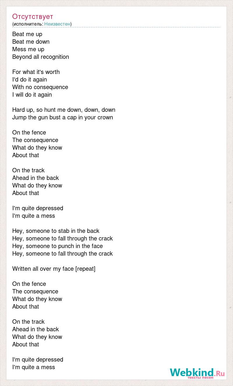 Beat me up Beat me down Mess me up Beyond all recognition For what it's worth I'd do it again With no consequence I will do it again Hard up, so hunt me down, down, down Jump the gun bust a cap in your crown On the fence The consequence What do they know About that On the track Ahead in the back What do they know About that I'm quite depressed I'm quite a mess Hey, someone to stab in the back Hey, someone to fall through the crack Hey, someone to punch in the face Hey, someone to fall through the crack Written all over my face [repeat] On the fence The consequence What do they know About that On the track Ahead in the back What do they know About that I'm quite depressed I'm quite a mess