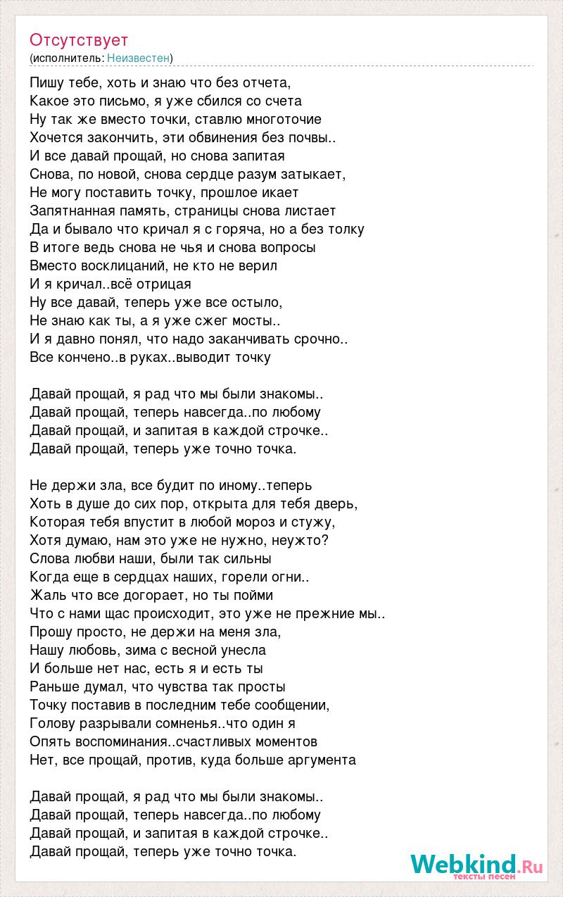 Пишу тебе, хоть и знаю что без отчета, Какое это письмо, я уже сбился со счета Ну так же вместо точки, ставлю многоточие Хочется закончить, эти обвинения без почвы.. И все давай прощай, но снова запитая Снова, по новой, снова сердце разум затыкает, Не могу поставить точку, прошлое икает Запятнанная память, страницы снова листает Да и бывало что кричал я с горяча, но а без толку В итоге ведь снова не чья и снова вопросы Вместо восклицаний, не кто не верил И я кричал..всё отрицая Ну все давай, теперь уже все остыло, Не знаю как ты, а я уже сжег мосты.. И я давно понял, что надо заканчивать срочно.. Все кончено..в руках..выводит точку Давай прощай, я рад что мы были знакомы.. Давай прощай, теперь навсегда..по любому Давай прощай, и запитая в каждой строчке.. Давай прощай, теперь уже точно точка. Не держи зла, все будит по иному..теперь Хоть в душе до сих пор, открыта для тебя дверь, Которая тебя впустит в любой мороз и стужу, Хотя думаю, нам это уже не нужно, неужто? Слова любви наши, были так сильны Когда еще в сердцах наших, горели огни.. Жаль что все догорает, но ты пойми Что с нами щас происходит, это уже не прежние мы.. Прошу просто, не держи на меня зла, Нашу любовь, зима с весной унесла И больше нет нас, есть я и есть ты Раньше думал, что чувства так просты Точку поставив в последним тебе сообщении, Голову разрывали сомненья..что один я Опять воспоминания..счастливых моментов Нет, все прощай, против, куда больше аргумента Давай прощай, я рад что мы были знакомы.. Давай прощай, теперь навсегда..по любому Давай прощай, и запитая в каждой строчке.. Давай прощай, теперь уже точно точка.