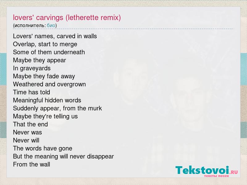 Lovers' names, carved in walls Overlap, start to merge Some of them underneath Maybe they appear In graveyards Maybe they fade away Weathered and overgrown Time has told Meaningful hidden words Suddenly appear, from the murk Maybe they're telling us That the end Never was Never will The words have gone But the meaning will never disappear From the wall