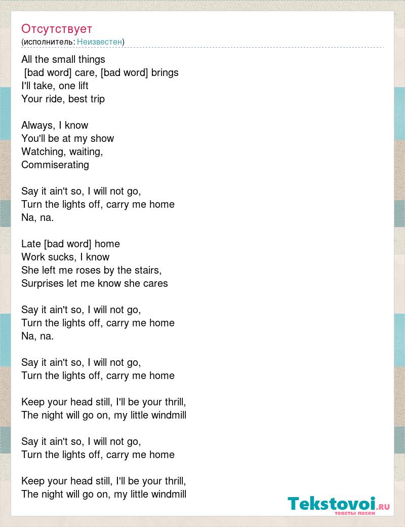 All the small things [bad word] care, [bad word] brings I'll take, one lift Your ride, best trip Always, I know You'll be at my show Watching, waiting, Сommiserating Say it ain't so, I will not go, Turn the lights off, carry me home Na, na. Late [bad word] home Work sucks, I know She left me roses by the stairs, Surprises let me know she cares Say it ain't so, I will not go, Turn the lights off, carry me home Na, na. Say it ain't so, I will not go, Turn the lights off, carry me home Keep your head still, I'll be your thrill, The night will go on, my little windmill Say it ain't so, I will not go, Turn the lights off, carry me home Keep your head still, I'll be your thrill, The night will go on, my little windmill