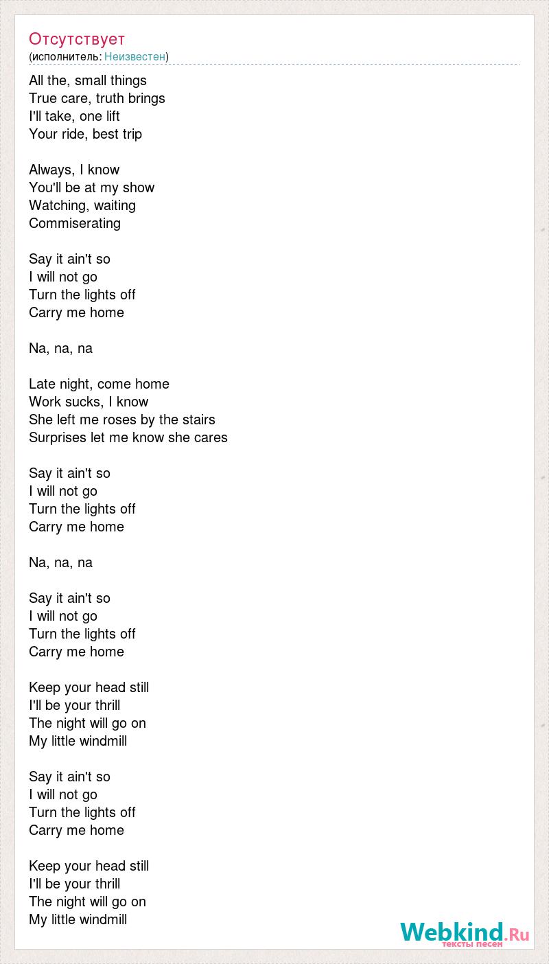 All the, small things [bad word] care, [bad word] brings I'll take, one lift Your ride, best trip Always, I know You'll be at my show Watching, [bad word] Say it ain't so I will not go Turn the lights off Carry me home Na, na, na Late [bad word] home Work sucks, I know She left me roses by the stairs Surprises let me know she cares Say it ain't so I will not go Turn the lights off Carry me home Na, na, na Say it ain't so I will not go Turn the lights off Carry me home Keep your head still I'll be your thrill The night will go on My little windmill Say it ain't so I will not go Turn the lights off Carry me home Keep your head still I'll be your thrill The night will go on My little windmill