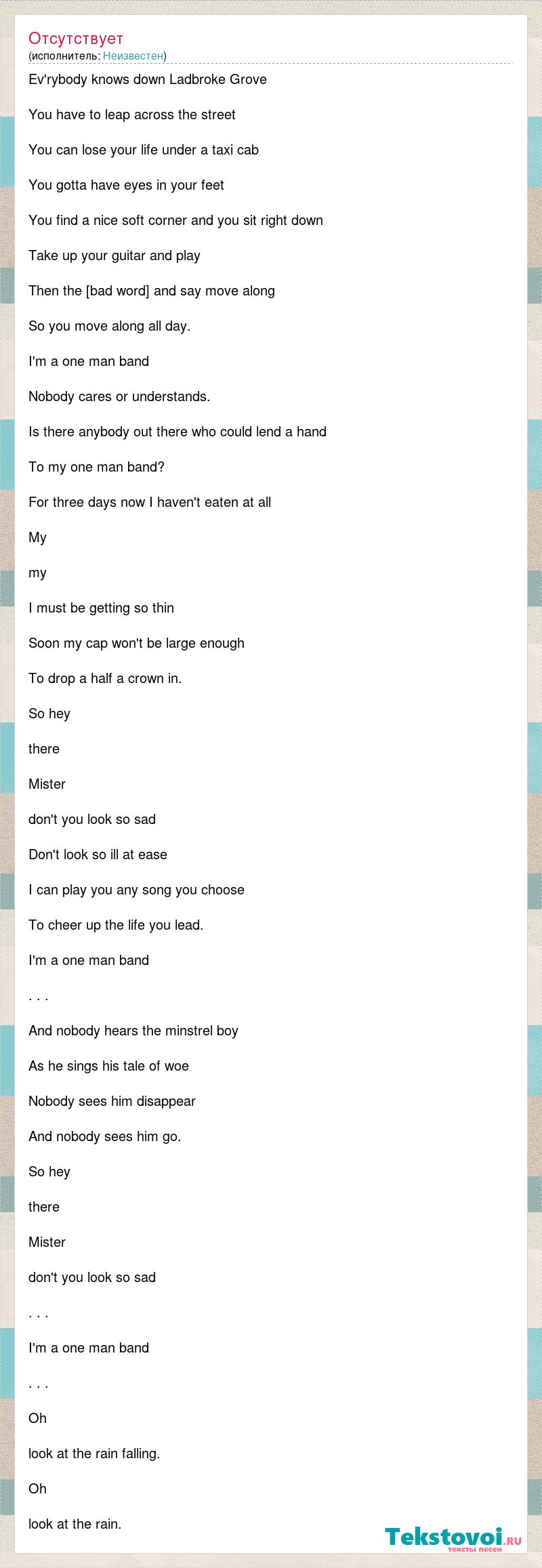 Ev'rybody knows down Ladbroke Grove You have to leap across the street You can lose your life under a taxi cab You gotta have eyes in your feet You find a nice soft corner and you sit right down Take up your guitar and play Then the [bad word] and say move along So you move along all day. I'm a one man band Nobody cares or understands. Is there anybody out there who could lend a hand To my one man band? For three days now I haven't eaten at all My my I must be getting so thin Soon my cap won't be large enough To drop a half a crown in. So hey there Mister don't you look so sad Don't look so ill at ease I can play you any song you choose To cheer up the life you lead. I'm a one man band . . . And nobody hears the minstrel boy As he sings his tale of woe Nobody sees him disappear And nobody sees him go. So hey there Mister don't you look so sad . . . I'm a one man band . . . Oh look at the rain falling. Oh look at the rain.