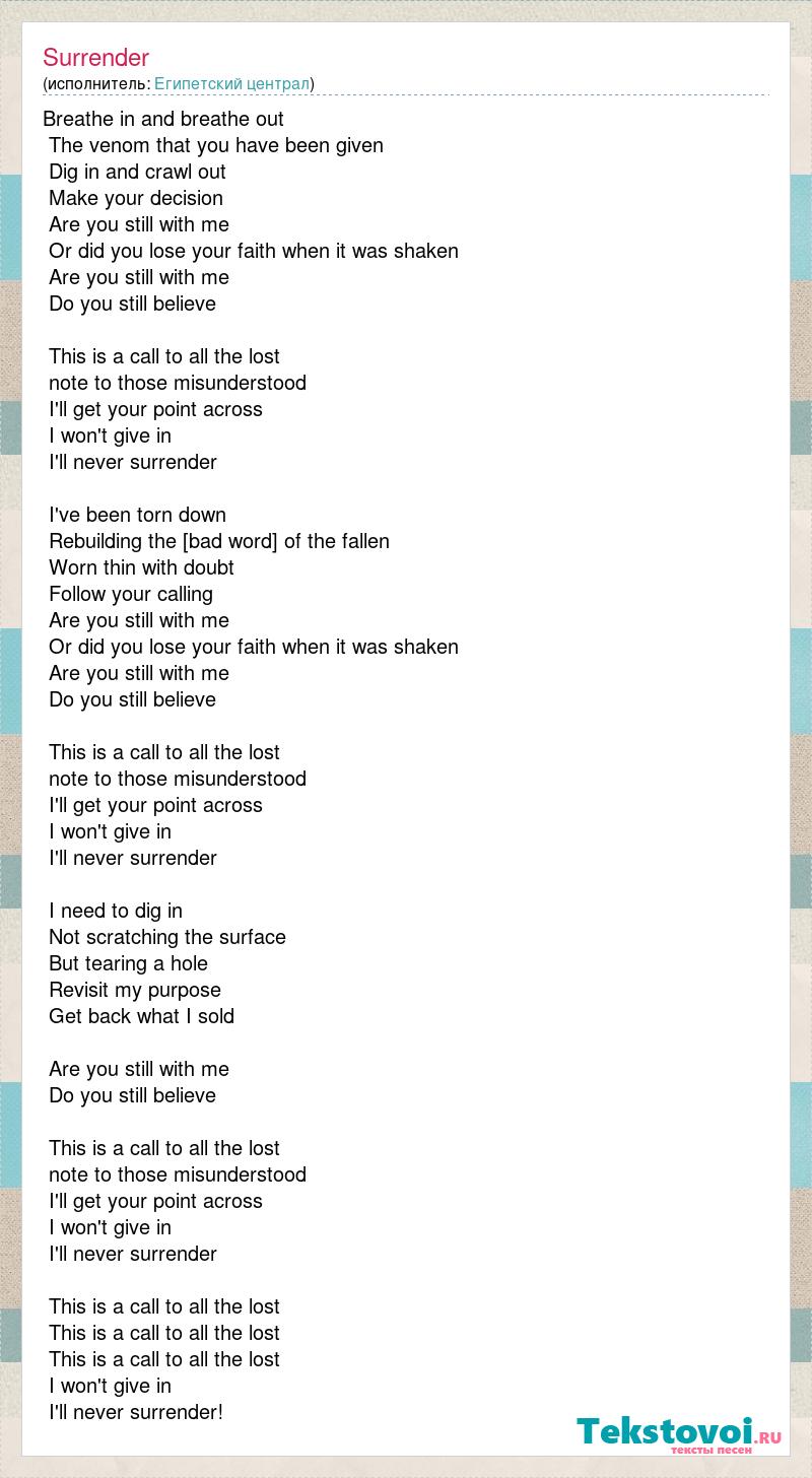 Breathe in and breathe out The venom that you have been given Dig in and crawl out Make your decision Are you still with me Or did you lose your faith when it was shaken Are you still with me Do you still believe This is a call to all the lost note to those misunderstood I'll get your point across I won't give in I'll never surrender I've been torn down Rebuilding the [bad word] of the fallen Worn thin with doubt Follow your calling Are you still with me Or did you lose your faith when it was shaken Are you still with me Do you still believe This is a call to all the lost note to those misunderstood I'll get your point across I won't give in I'll never surrender I need to dig in Not scratching the surface But tearing a hole Revisit my purpose Get back what I sold Are you still with me Do you still believe This is a call to all the lost note to those misunderstood I'll get your point across I won't give in I'll never surrender This is a call to all the lost This is a call to all the lost This is a call to all the lost I won't give in I'll never surrender!