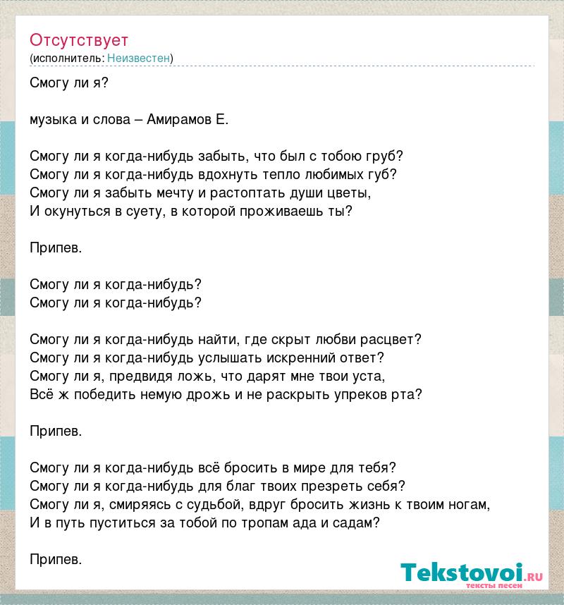 Смогу ли я? музыка и слова – Амирамов Е. Смогу ли я когда-нибудь забыть, что был с тобою груб? Смогу ли я когда-нибудь вдохнуть тепло любимых губ? Смогу ли я забыть мечту и растоптать души цветы, И окунуться в суету, в которой проживаешь ты? Припев. Смогу ли я когда-нибудь? Смогу ли я когда-нибудь? Смогу ли я когда-нибудь найти, где скрыт любви расцвет? Смогу ли я когда-нибудь услышать искренний ответ? Смогу ли я, предвидя ложь, что дарят мне твои уста, Всё ж победить немую дрожь и не раскрыть упреков рта? Припев. Смогу ли я когда-нибудь всё бросить в мире для тебя? Смогу ли я когда-нибудь для благ твоих презреть себя? Смогу ли я, смиряясь с судьбой, вдруг бросить жизнь к твоим ногам, И в путь пуститься за тобой по тропам ада и садам? Припев.